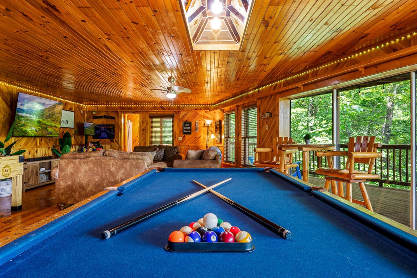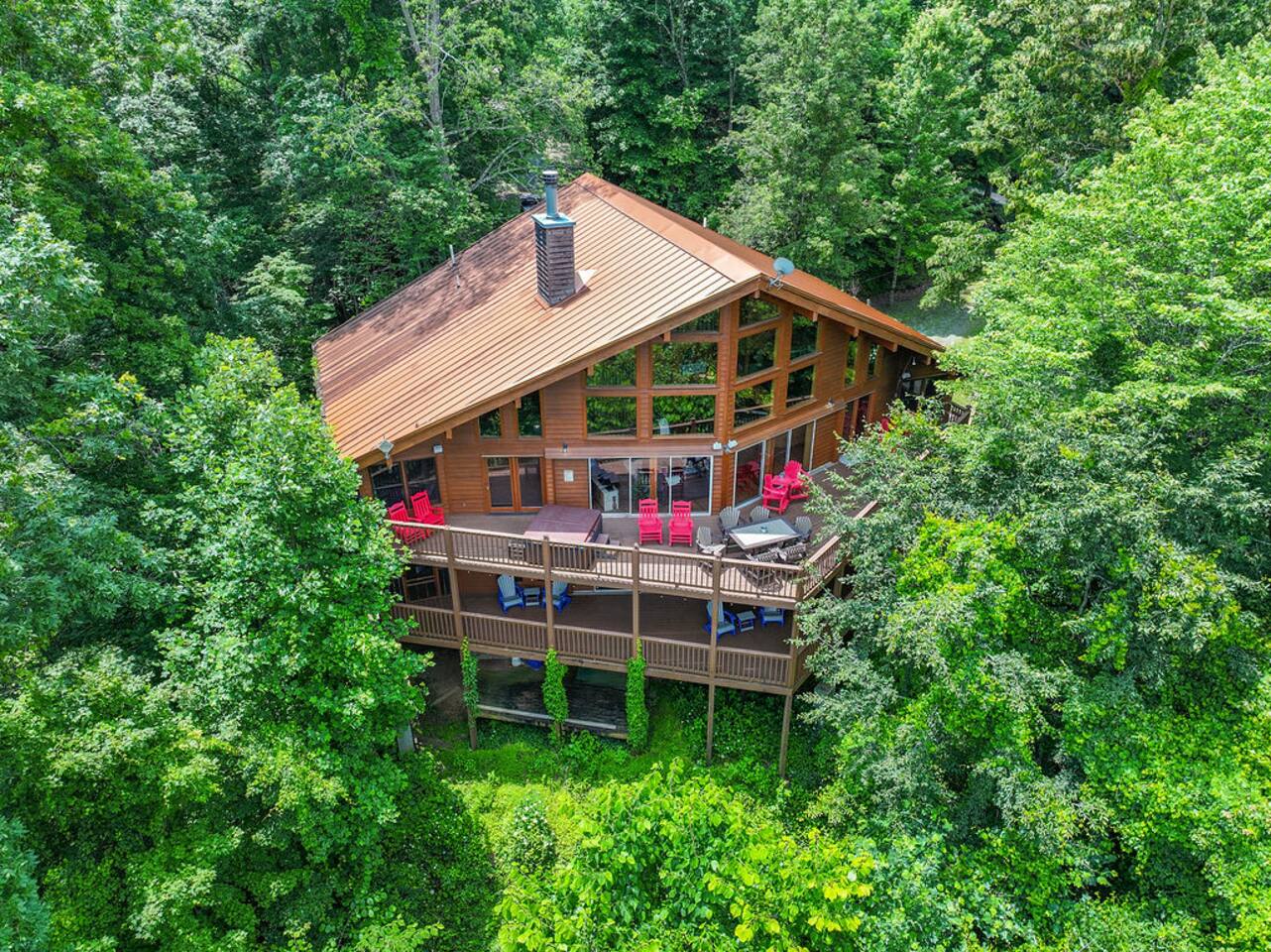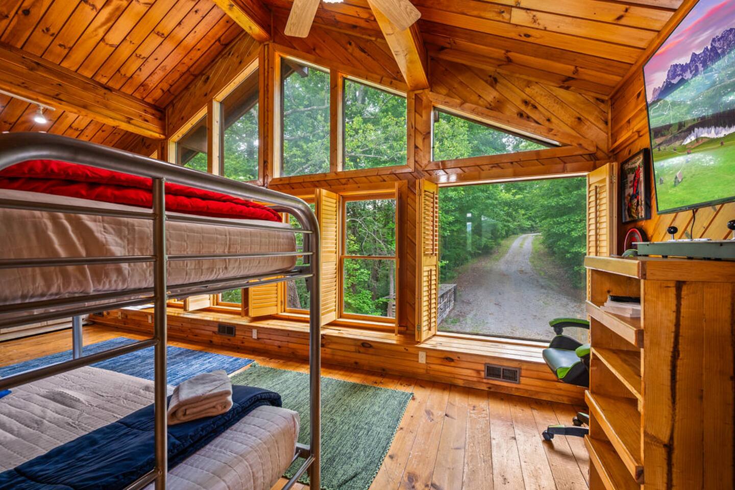 The lower level also serves as the hub for fun and relaxation. Challenge friends to a game of pool or poker in the game room, enjoy drinks at the bar, or head outside to soak in the peaceful mountain atmosphere. With ample deck space and screened porches, there’s no shortage of ways to unwind.