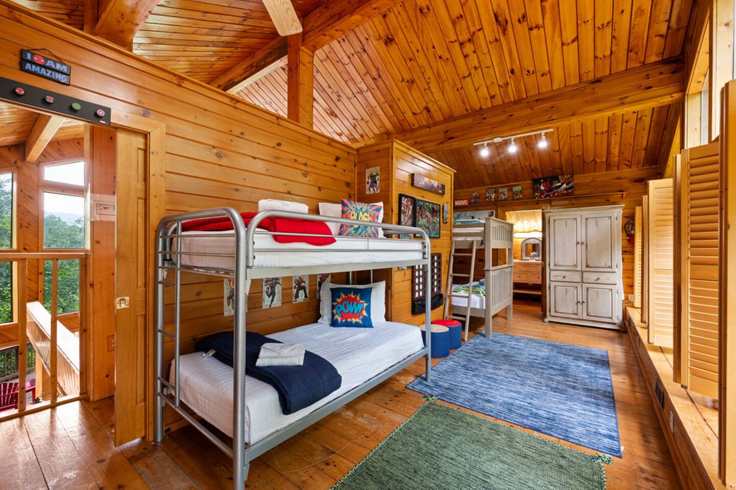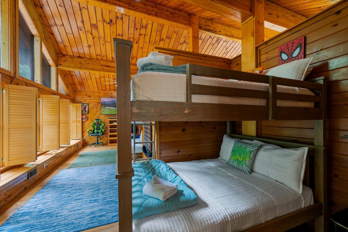 - Upper Level: A private sleeping area with a queen bunk bed, a large closet, and its own bathroom.