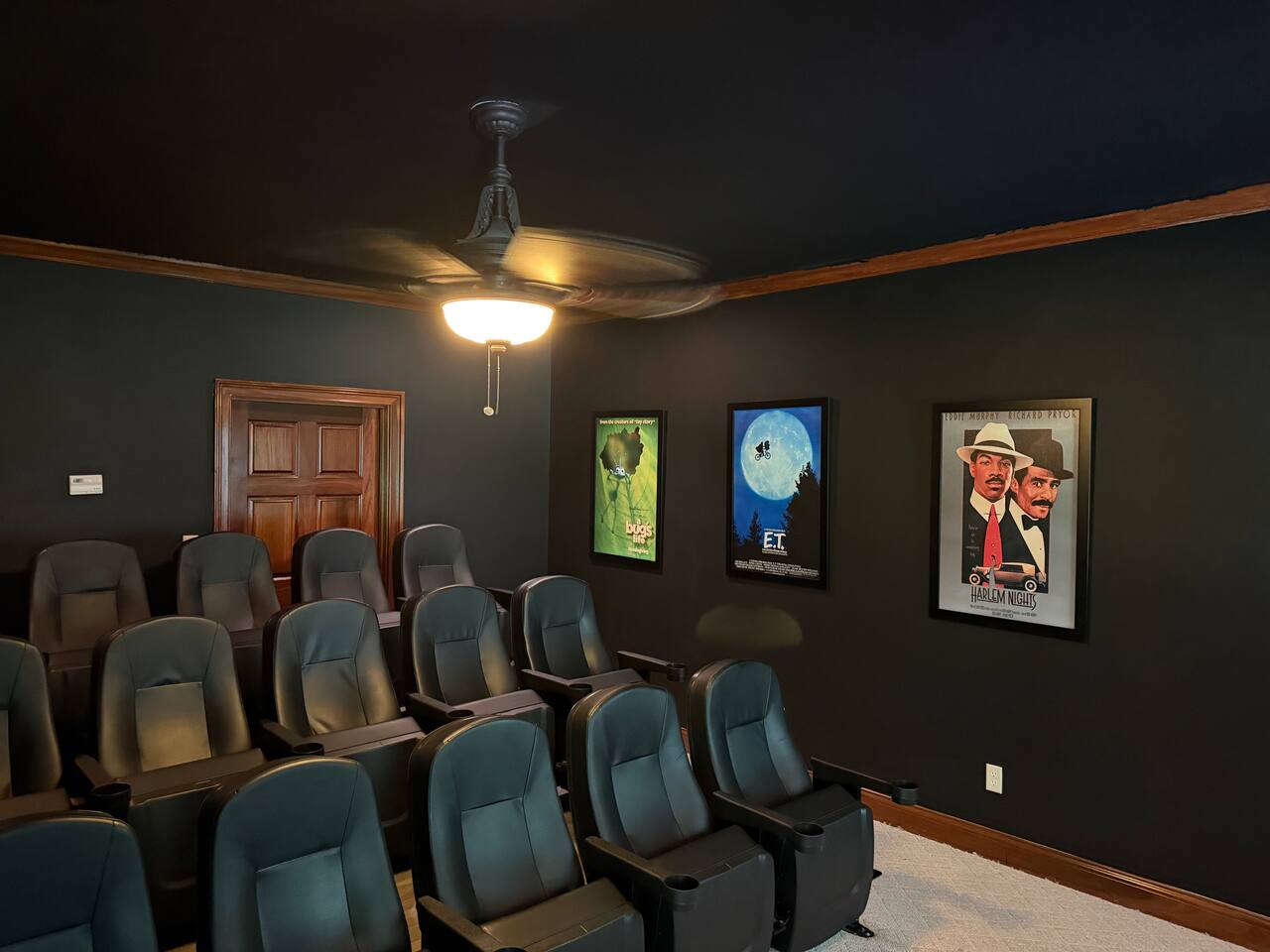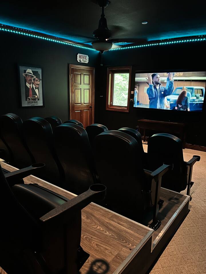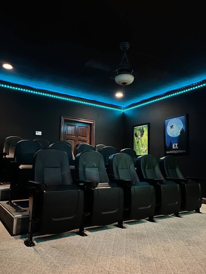 The cinema has seating for 15 with a big screen TV, sound bar, and LED lighting. The 85’ TV streams.
