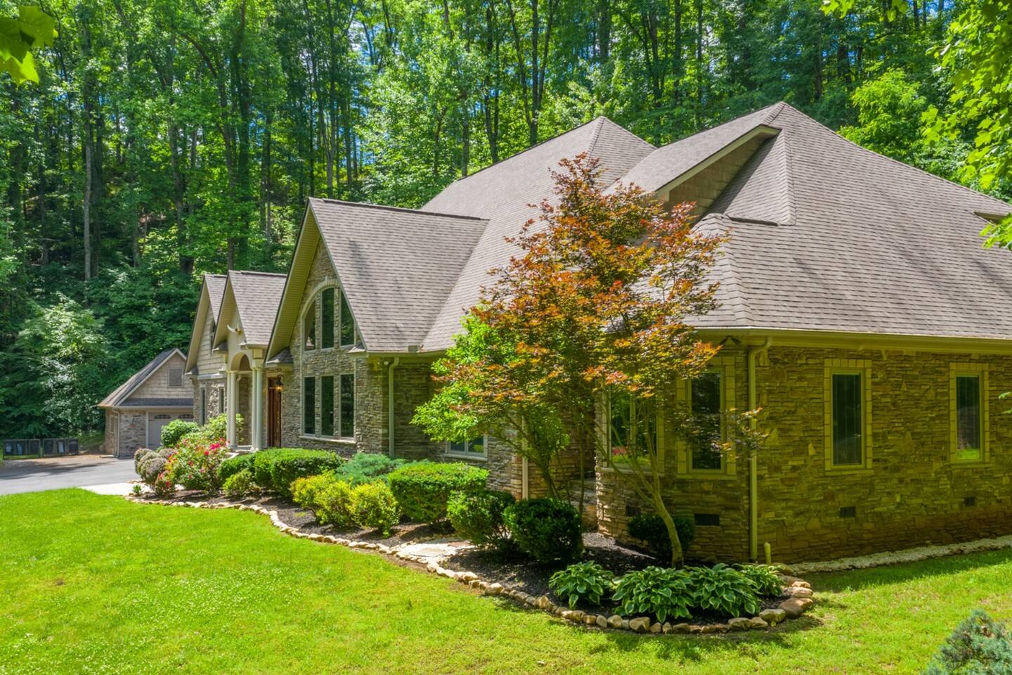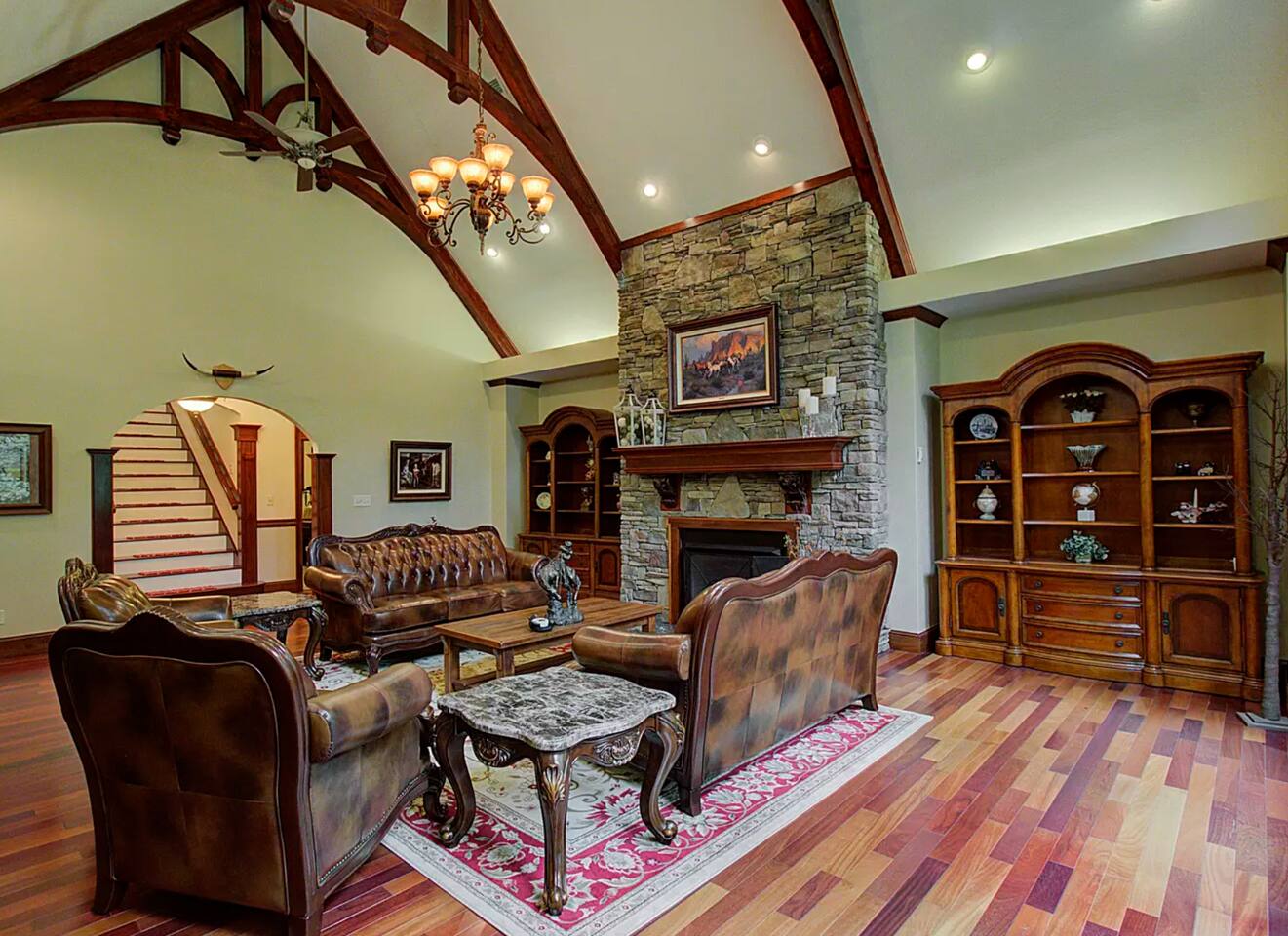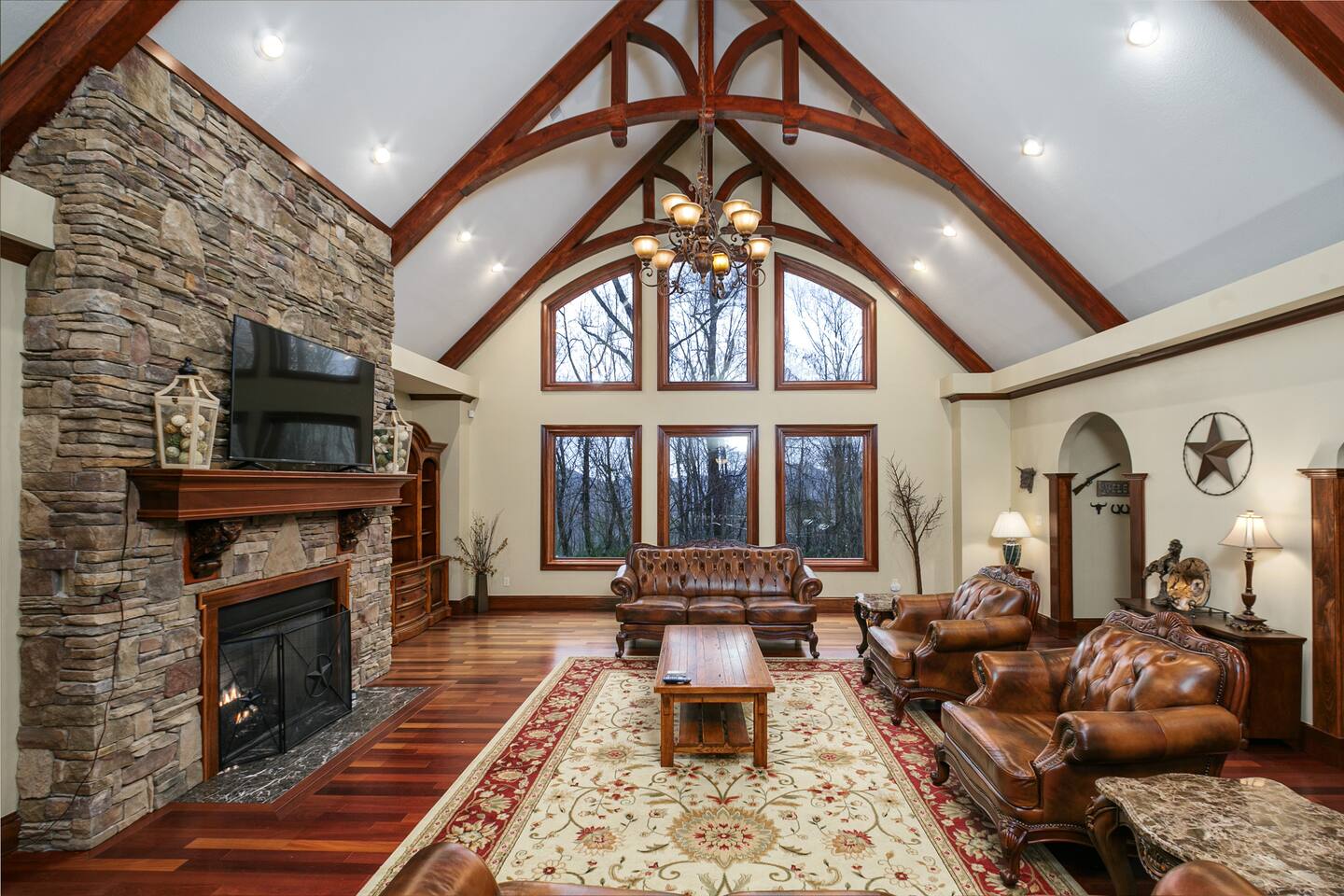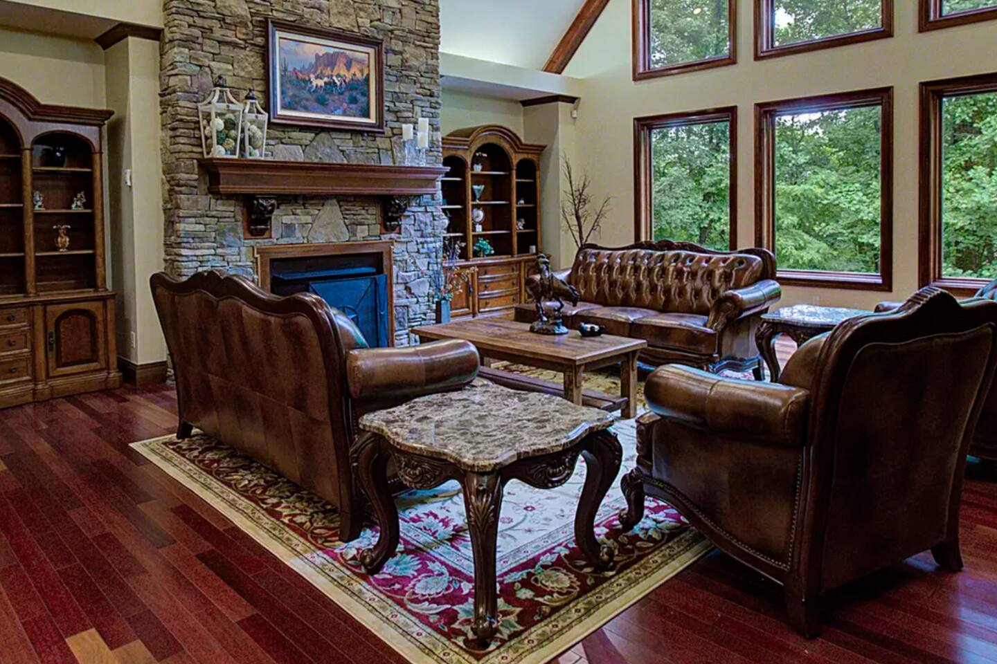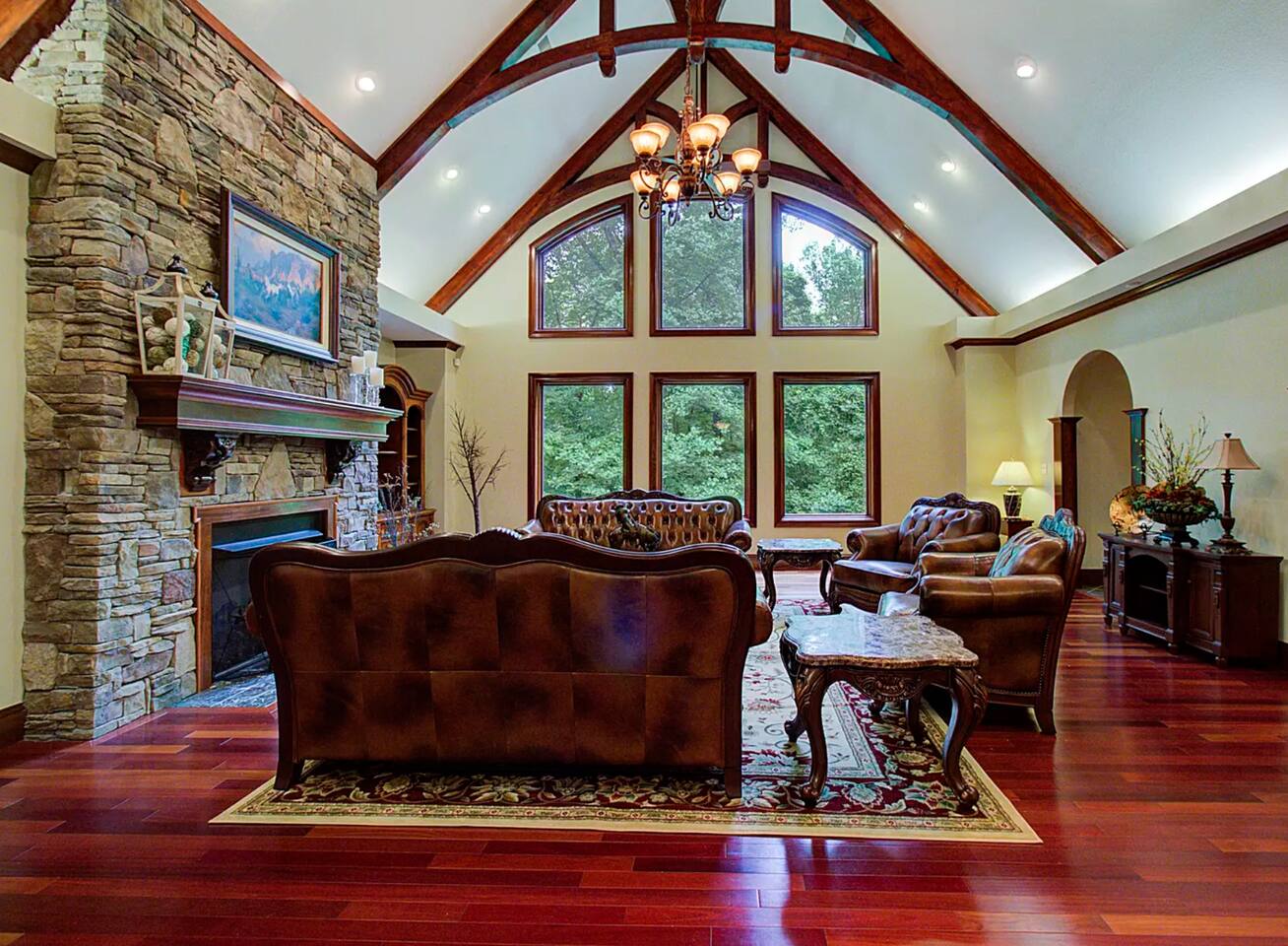 The main family room has a large stone fireplace, vaulted ceiling, and generous lighting through big windows.