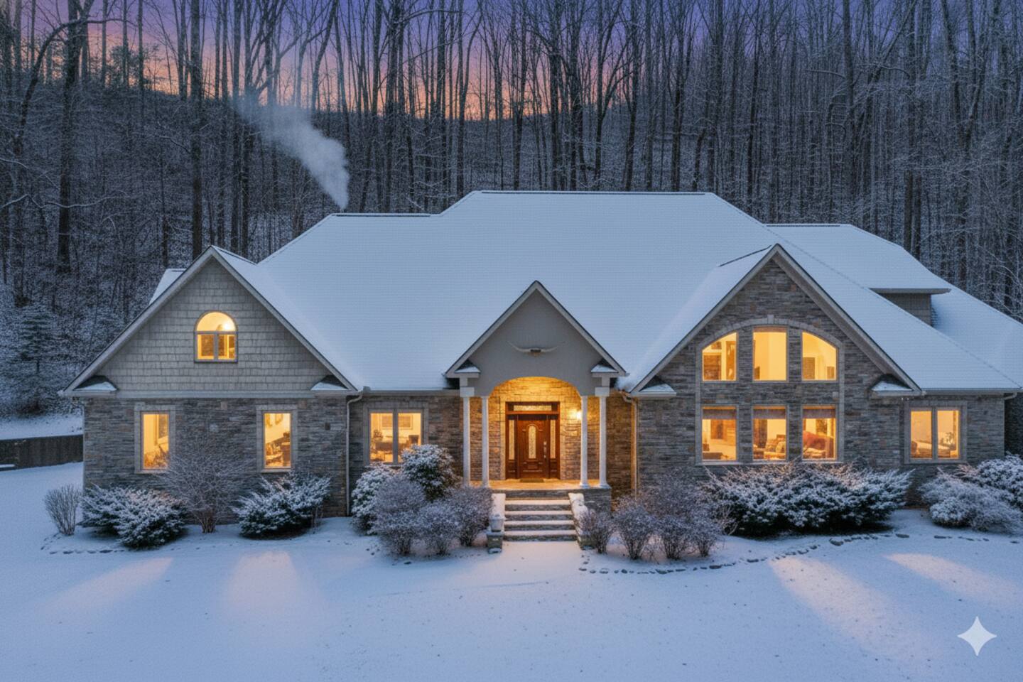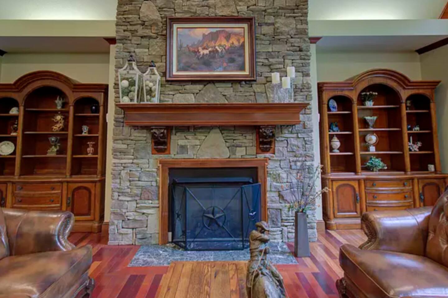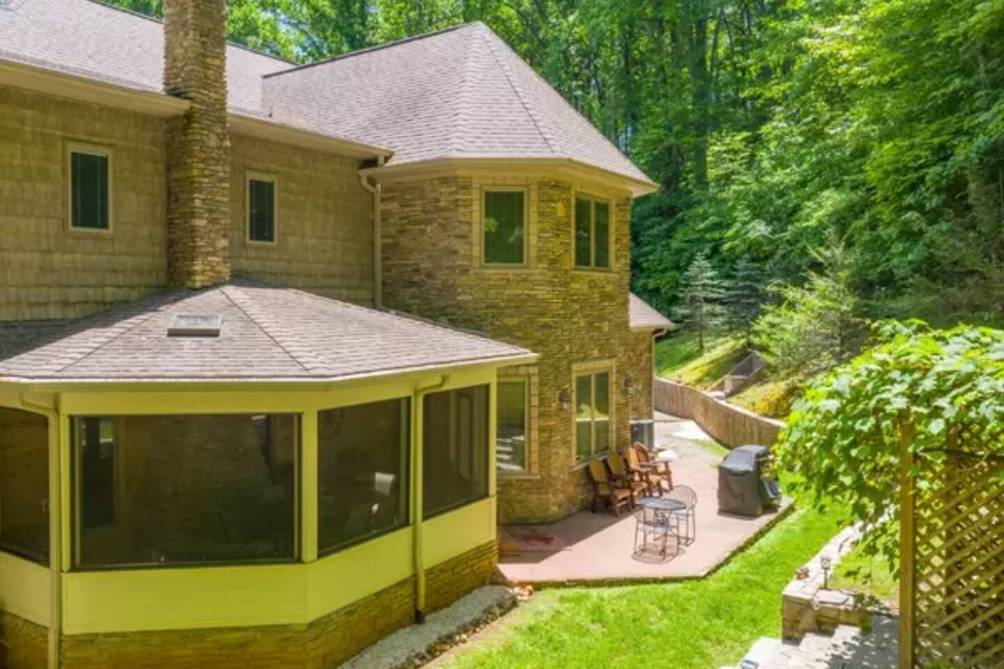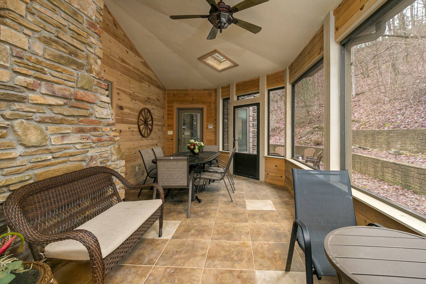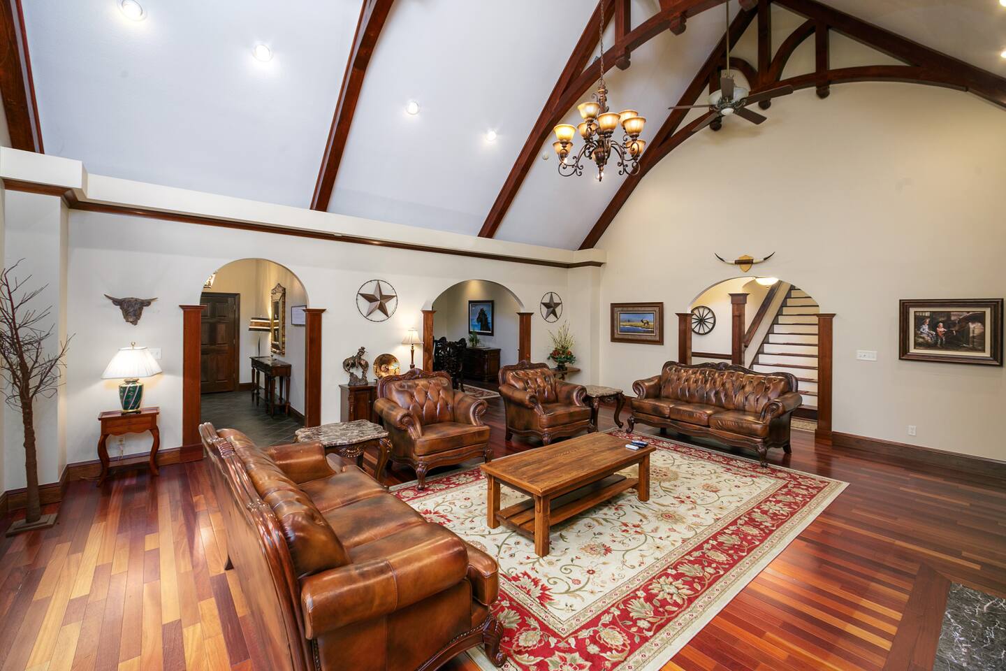 The main family room has a large stone fireplace, vaulted ceiling, and generous lighting through big windows.
