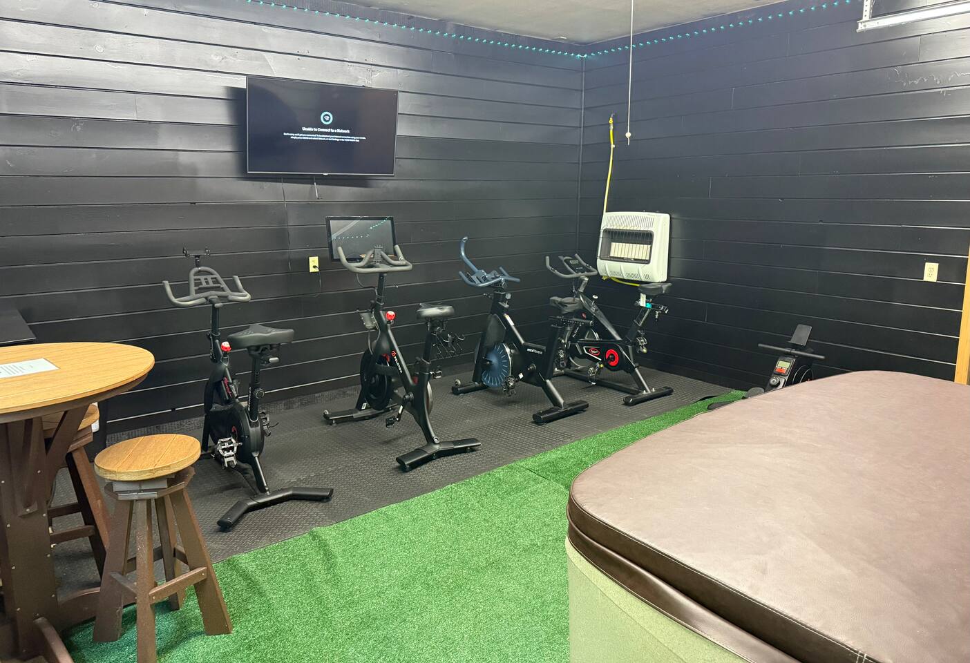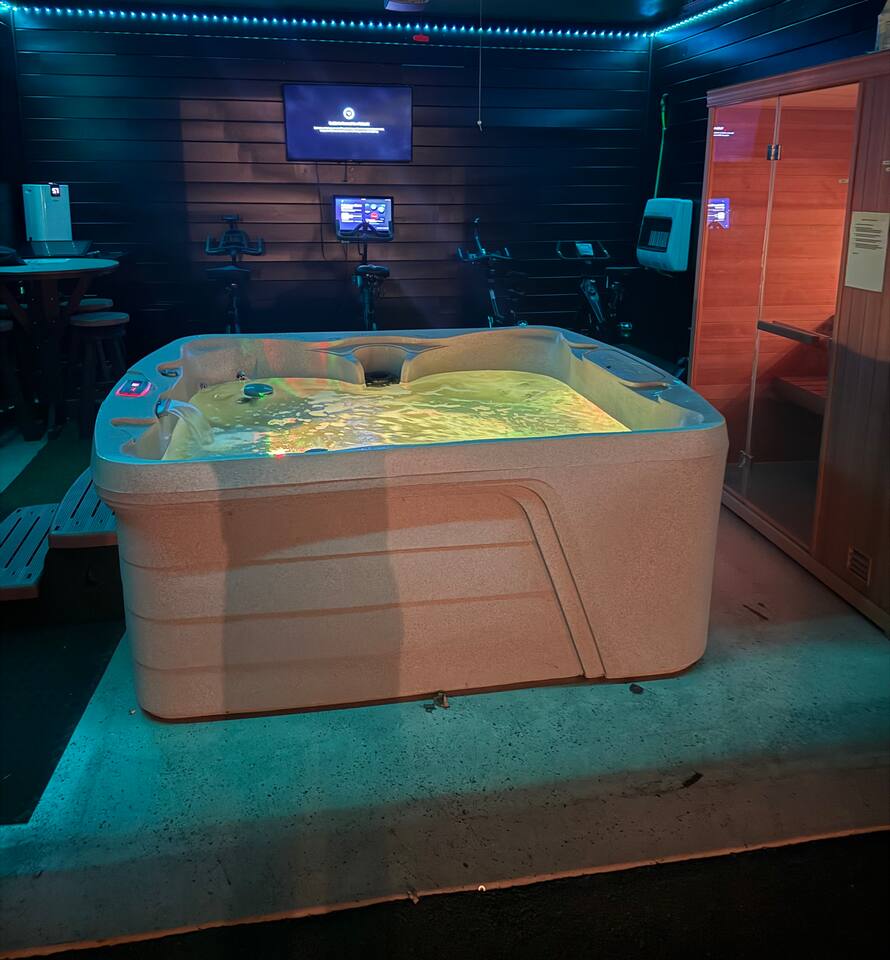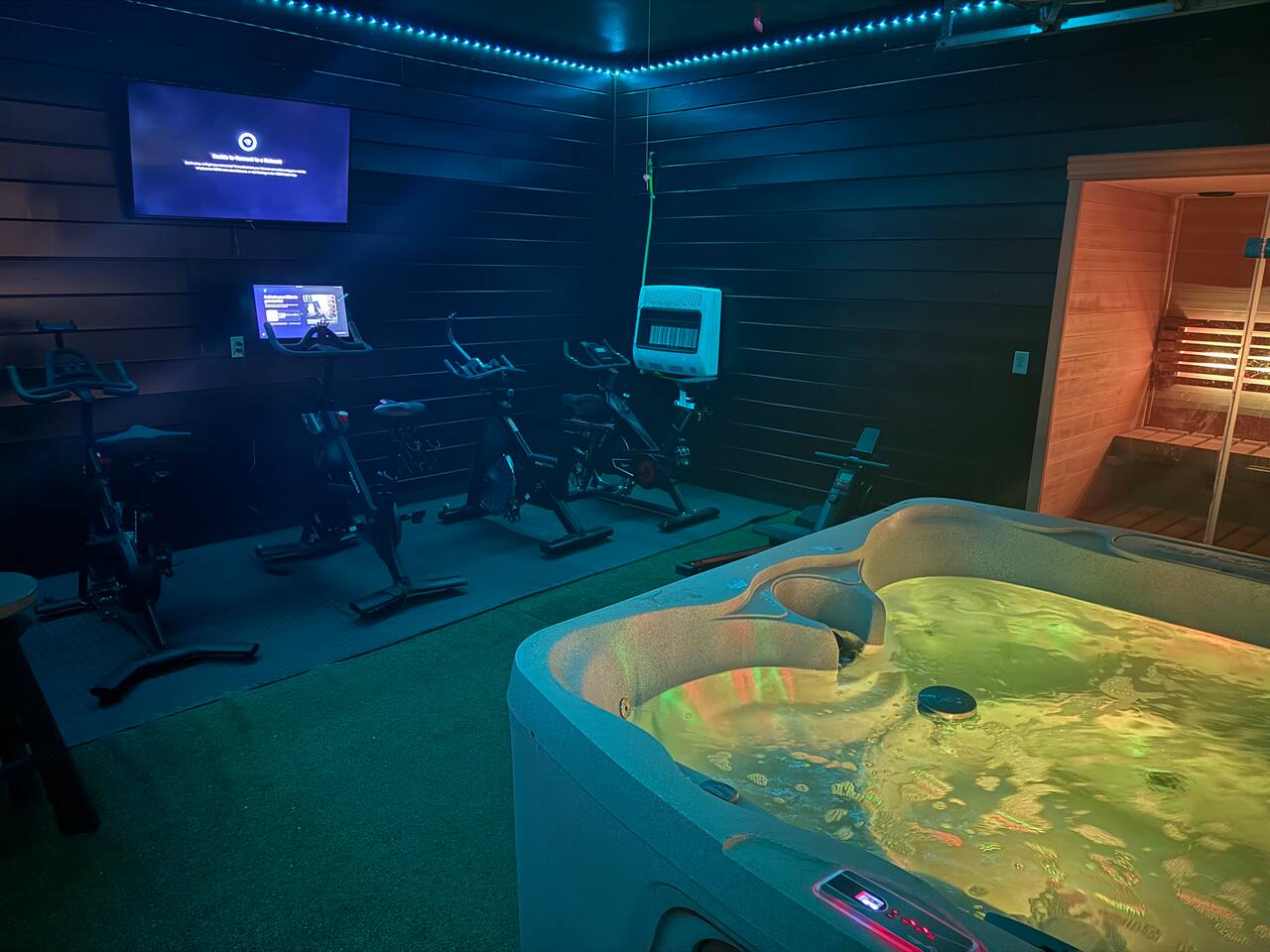 The fitness center has a hot tub, sauna, pub table, stationary bikes, peloton, row machine, TRX bands, bench, and weights.