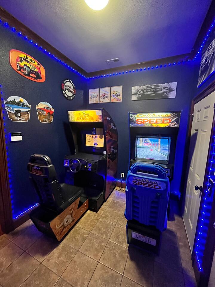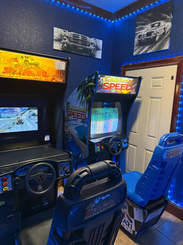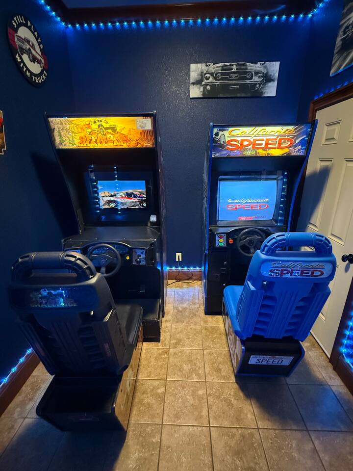 The race room has California Speed and Off Road Deluxe sit down race arcades-very rare experience!