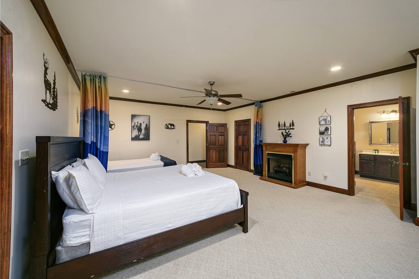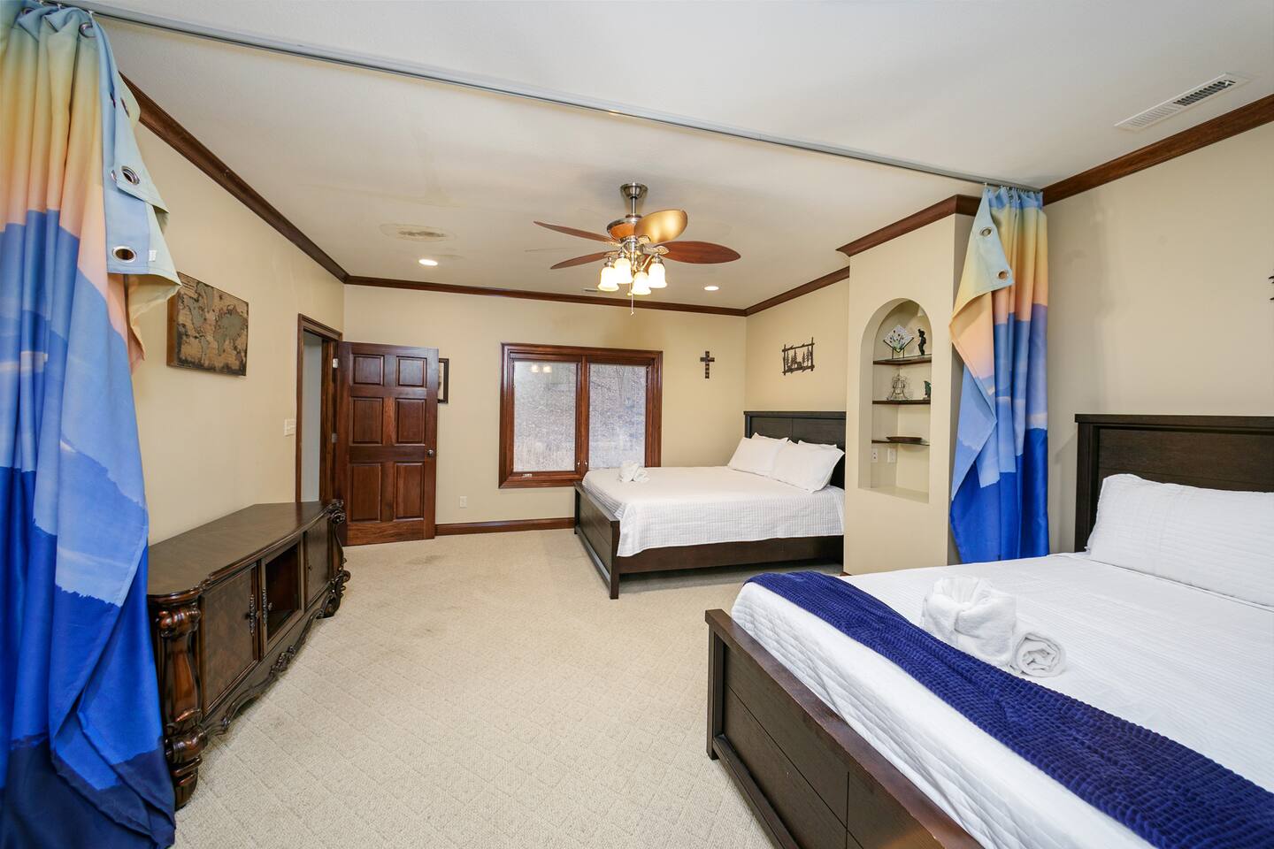 Two bedrooms have two beds in each room with curtain partitions. One bedroom has two king beds with no partition. There is also a loft with five bunk beds and two trundles. The loft has air hockey, foosball, & a sit down dual arcade system.