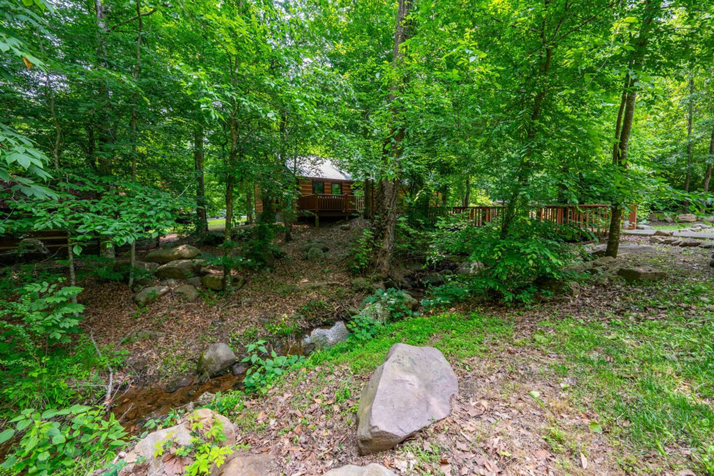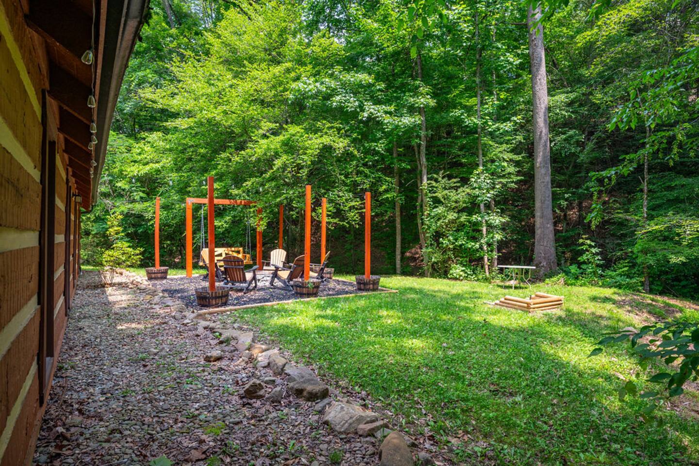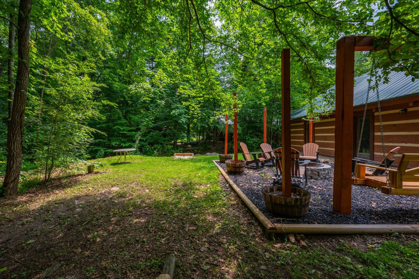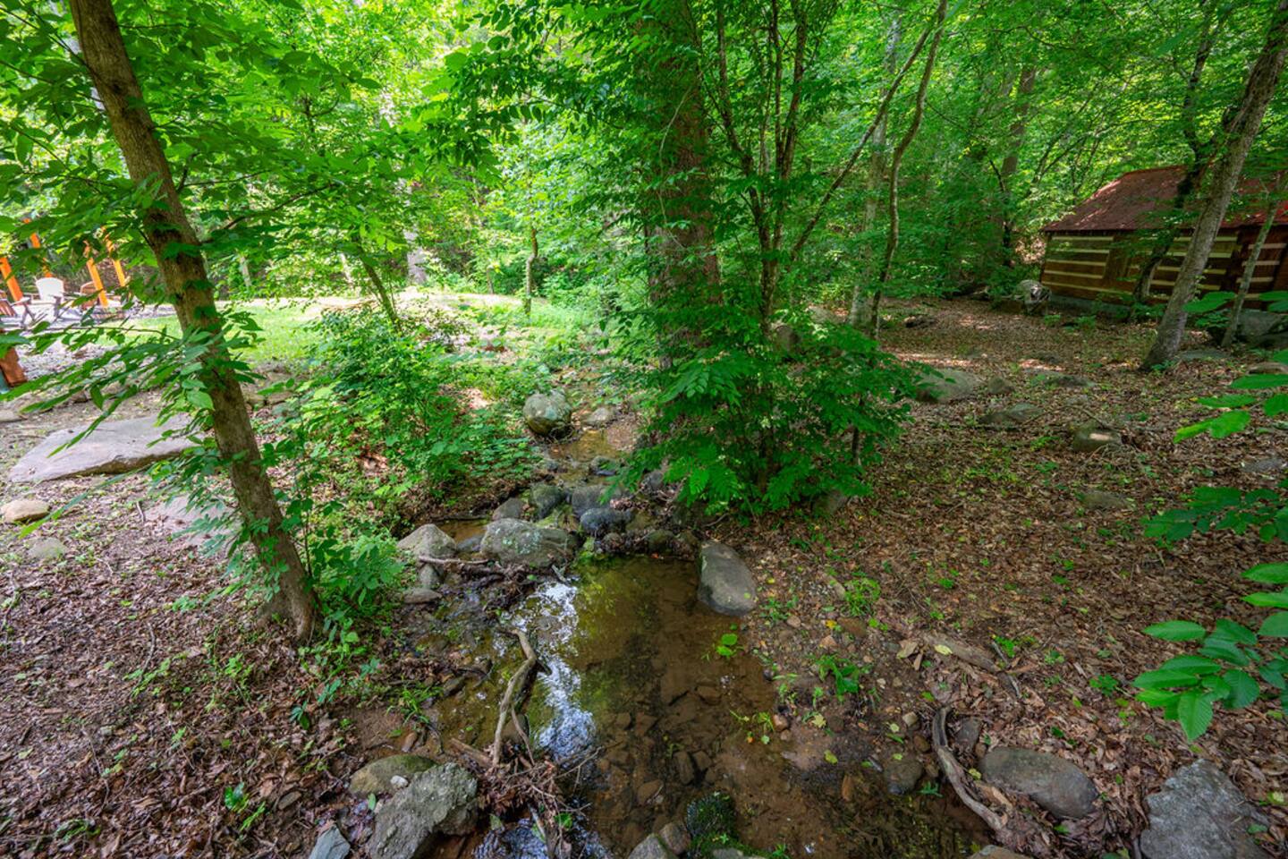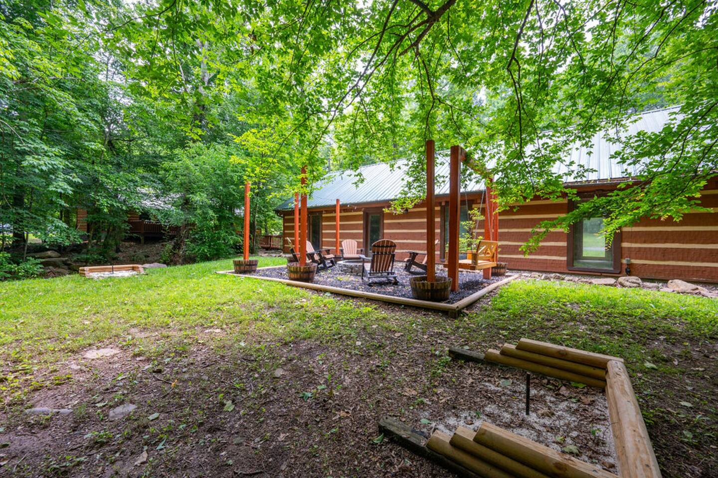 Property with a running creek through the middle and a large fire pit, swing, and horseshoe pit mirroring the cabin