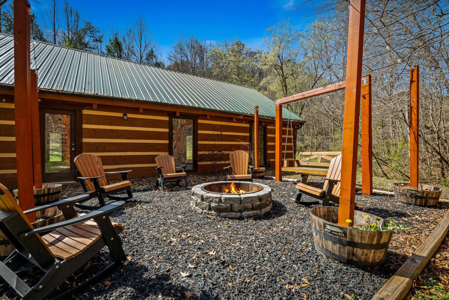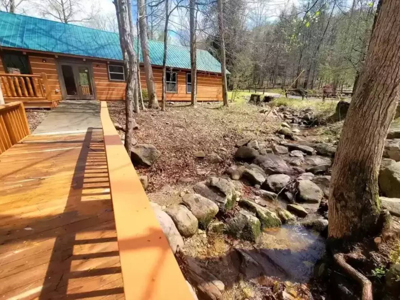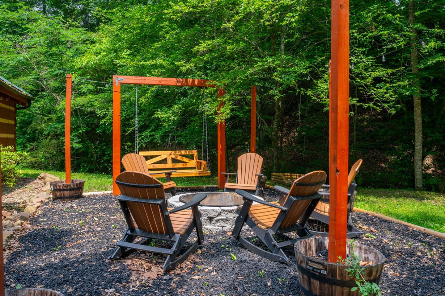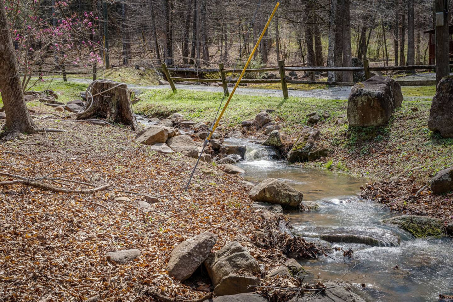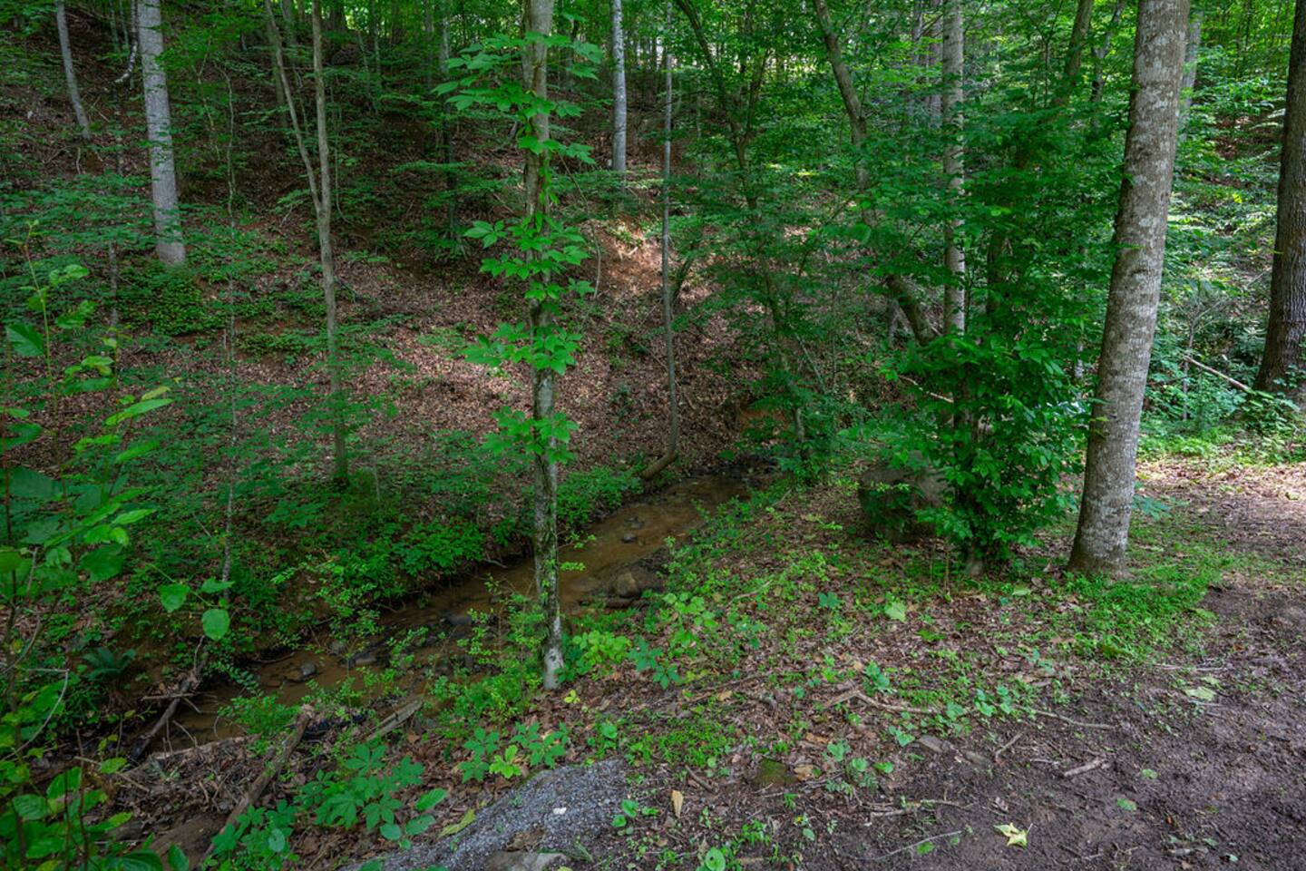 Property with a running creek through the middle and a large fire pit, swing, and horseshoe pit mirroring the cabin