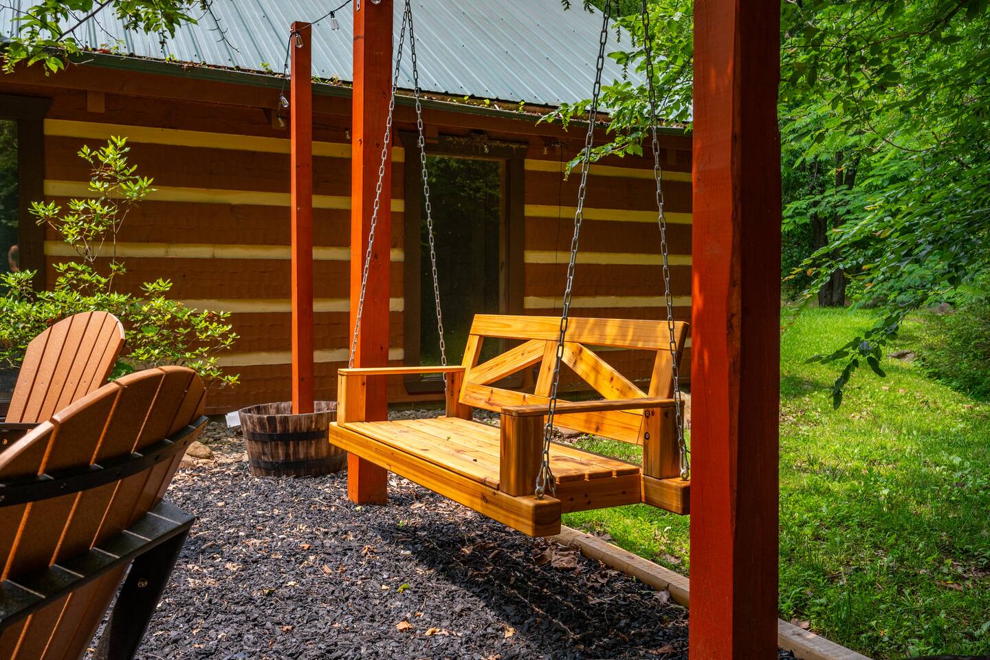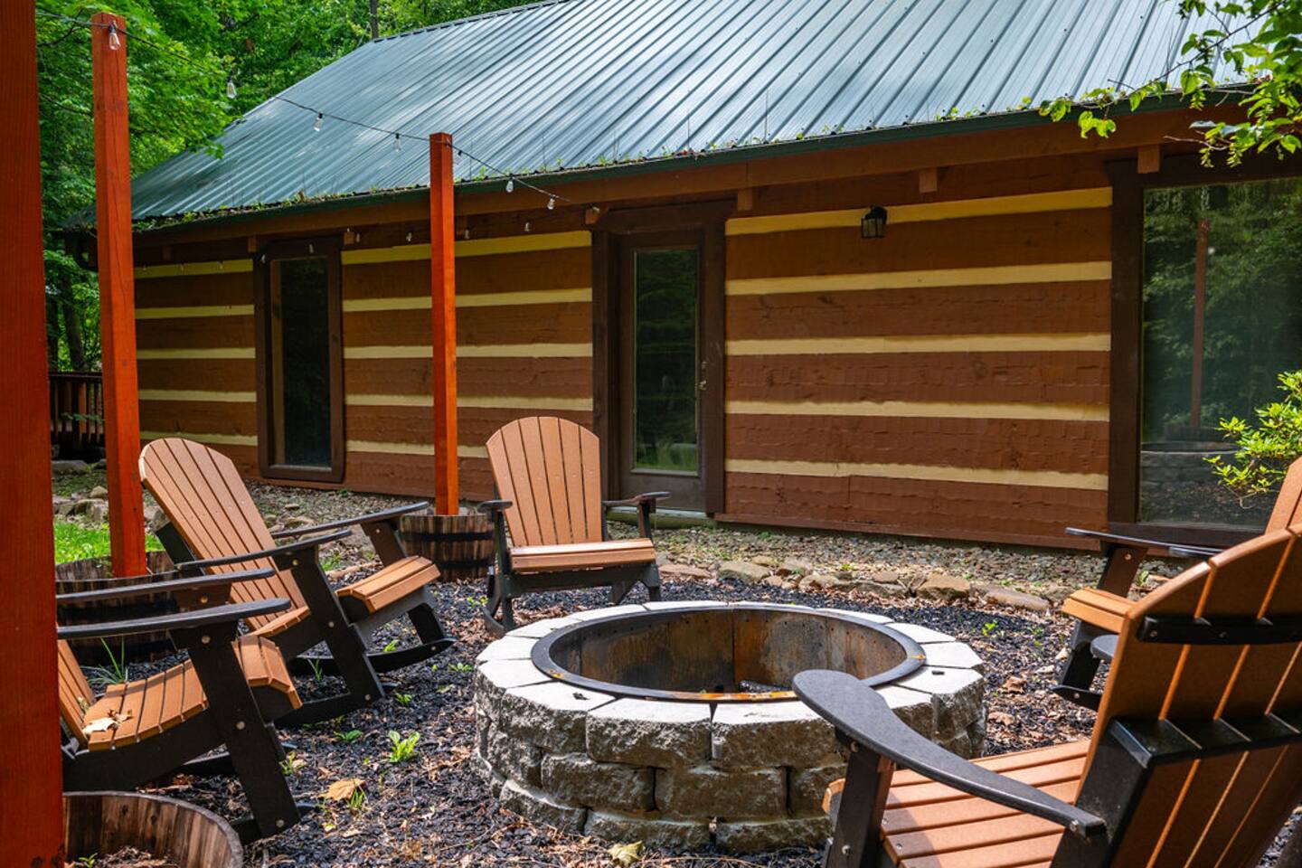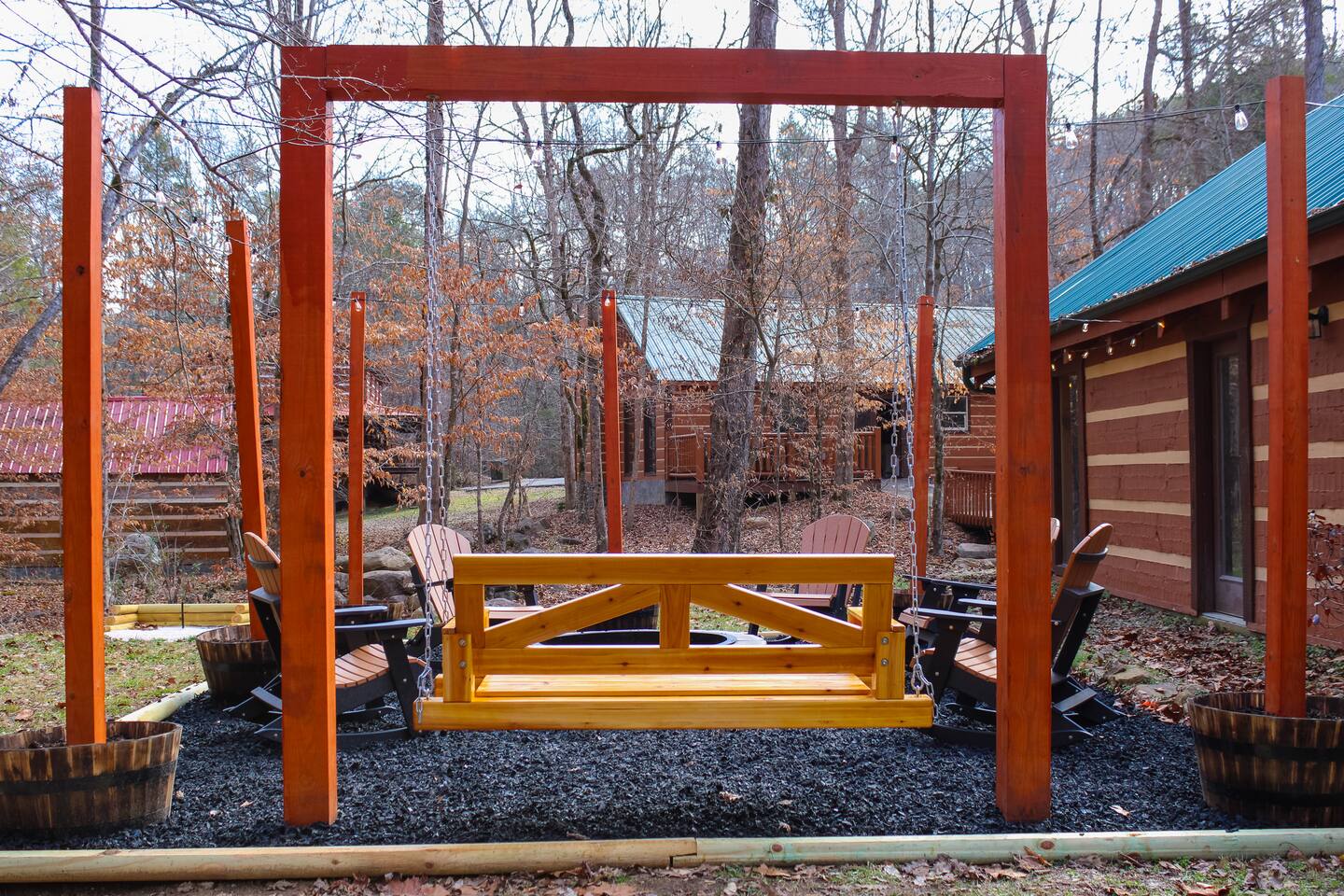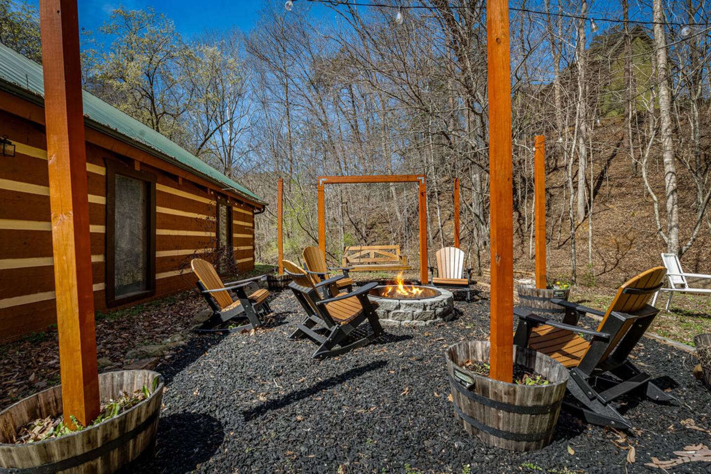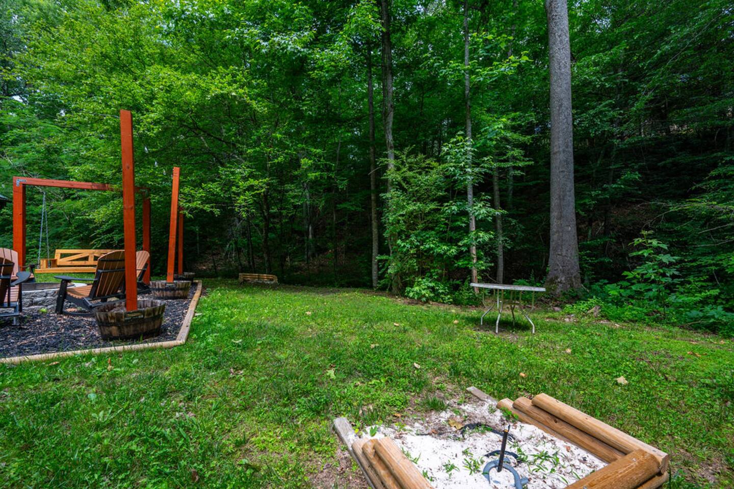 Property with a running creek through the middle and a large fire pit, swing, and horseshoe pit mirroring the cabin