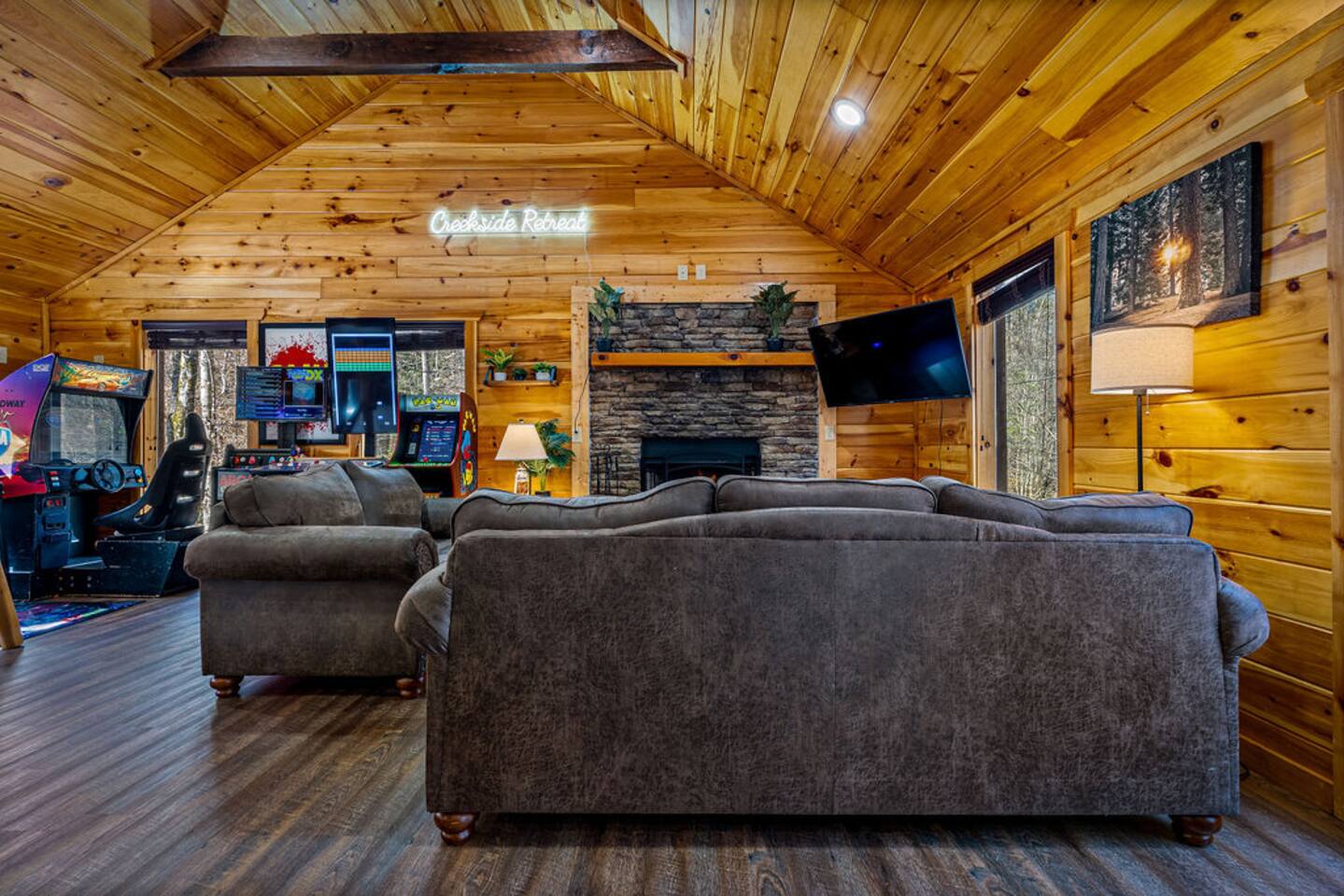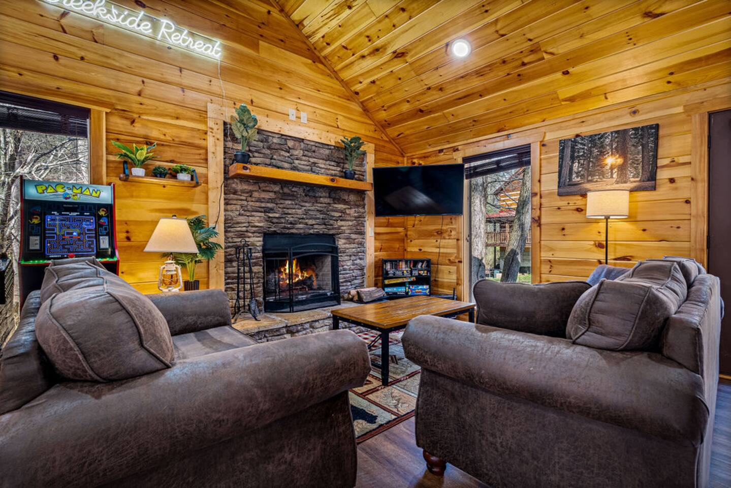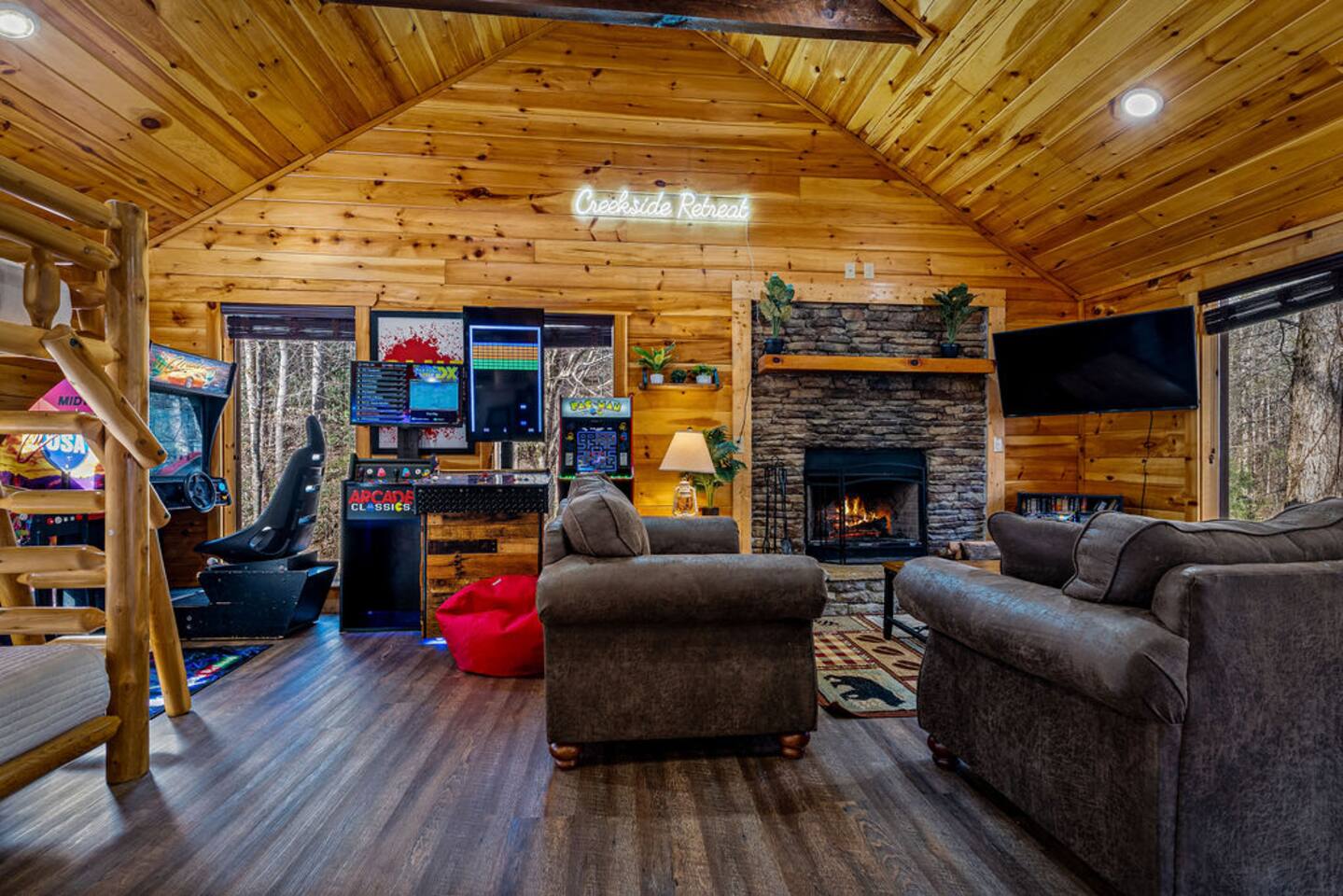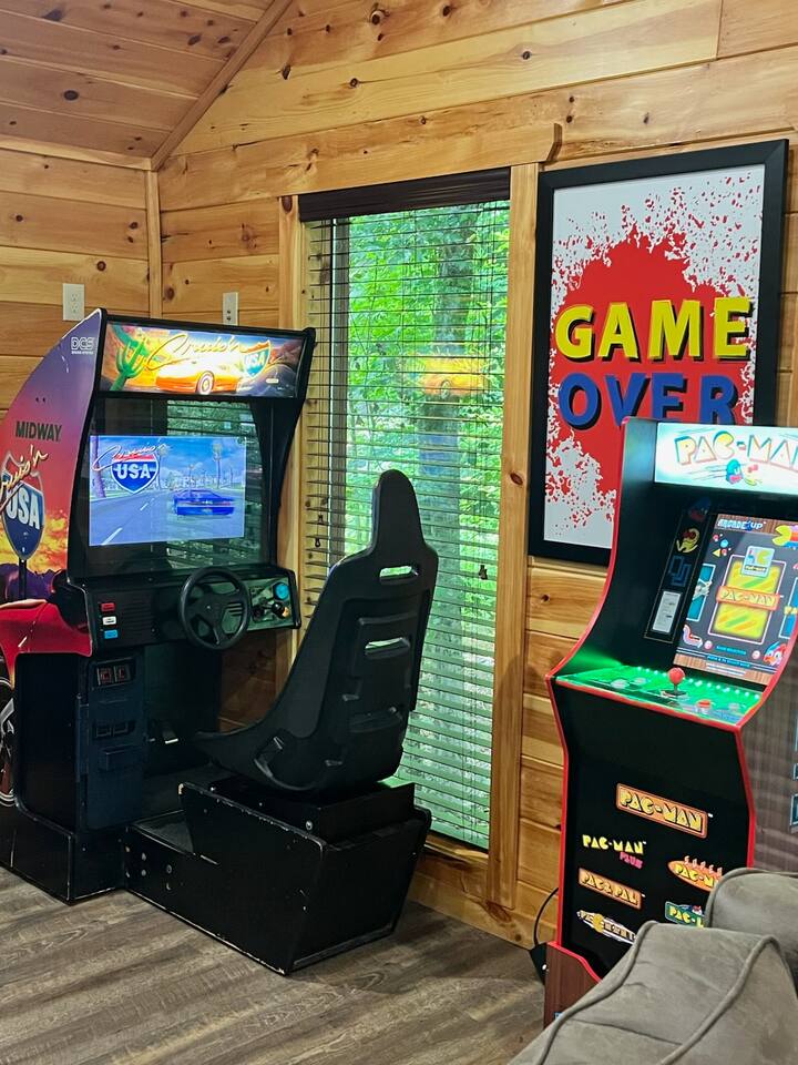 Keep everyone entertained with a built-in arcade machine, board games, and fast WiFi. The cabin also features smart TVs and streaming options.