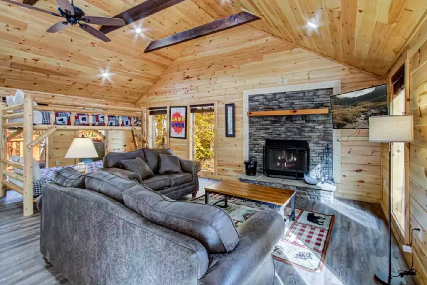 Step into an inviting open-concept living room with a warm fireplace, plush seating, and a large flat-screen TV ideal for family movie nights or unwinding after a day of adventure.
