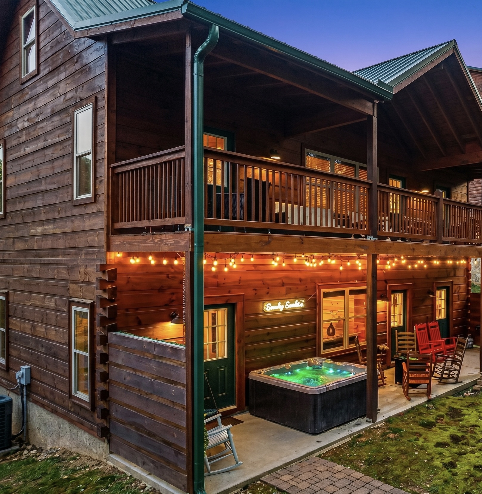 This cabin can accommodate 12 guests. There are two bedrooms on the first floor. Each has a full size ensuite and access to the rear patio, where the hot tub faces the wood.