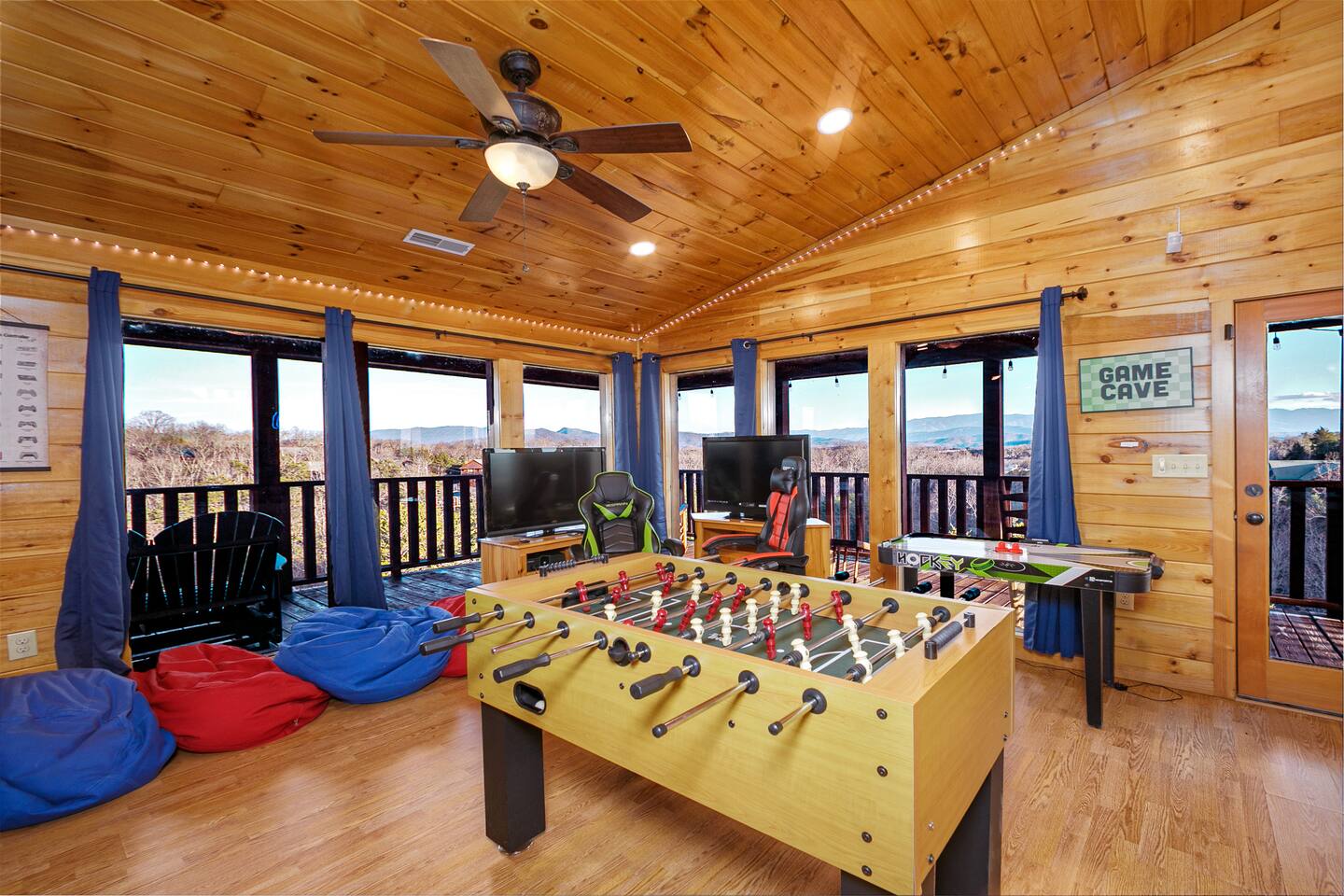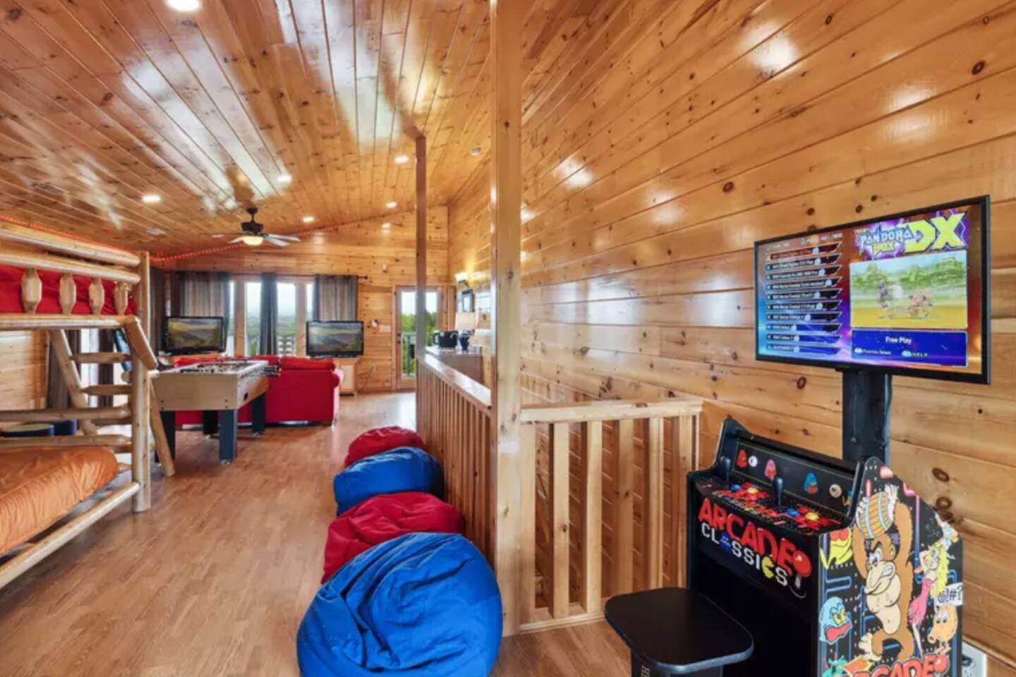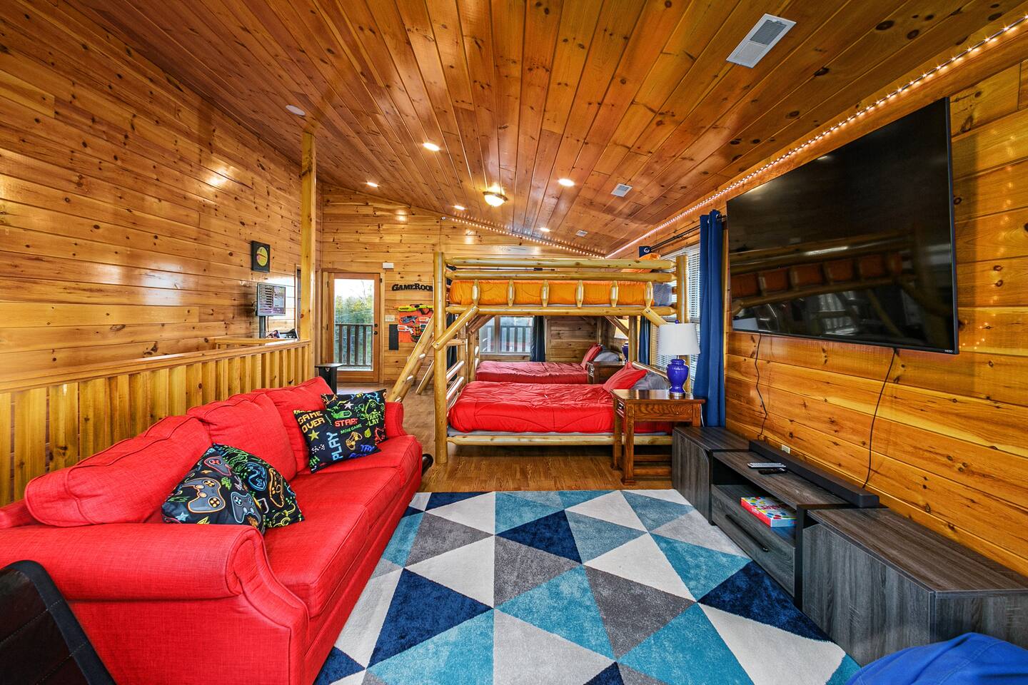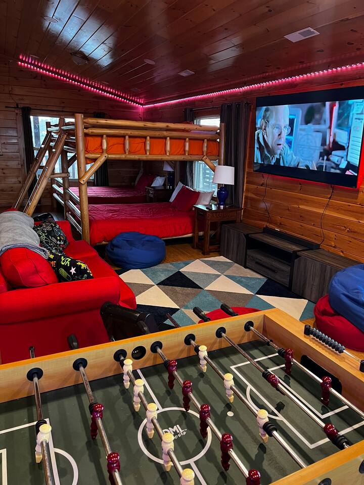 - Third level (Kids' Zone): Brightly decorated with gaming chairs, TVs, and arcade games. Includes two queen-over-queen bunk beds, a king bedroom, and a bedroom with additional queen-over-queen bunks—perfect for families traveling with children.