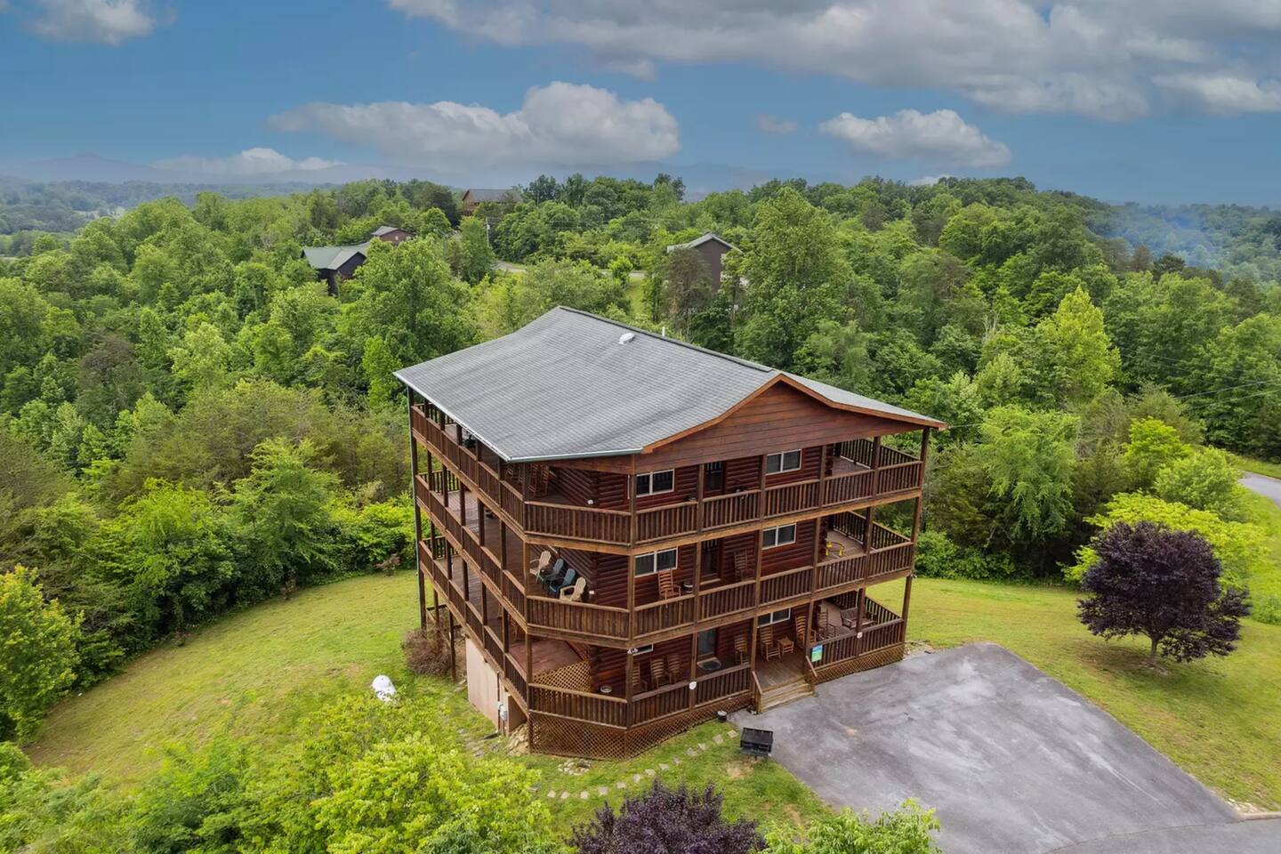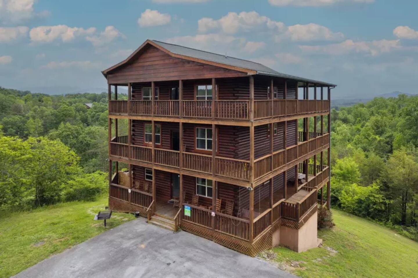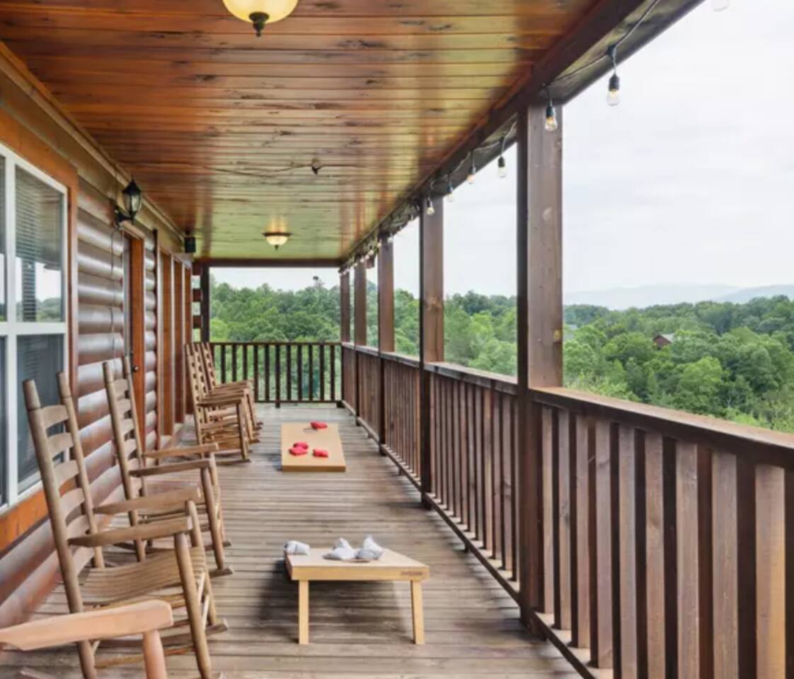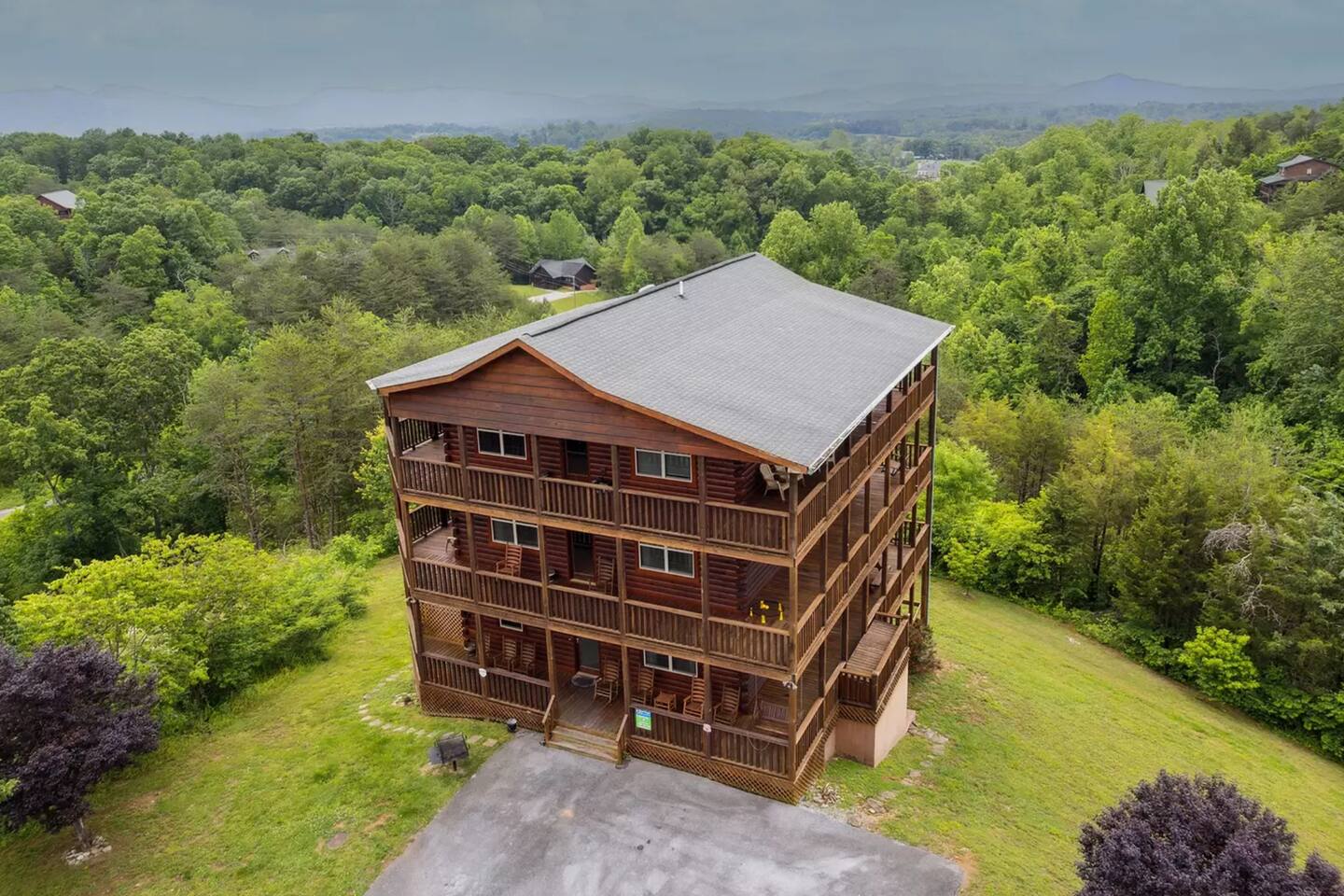 - Each level features wraparound porches with panoramic views of the Great Smoky Mountains.