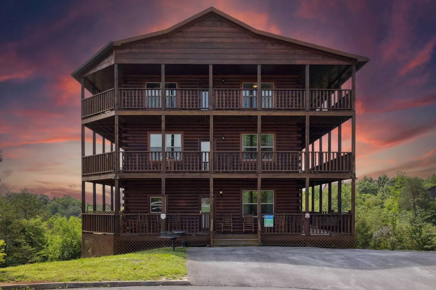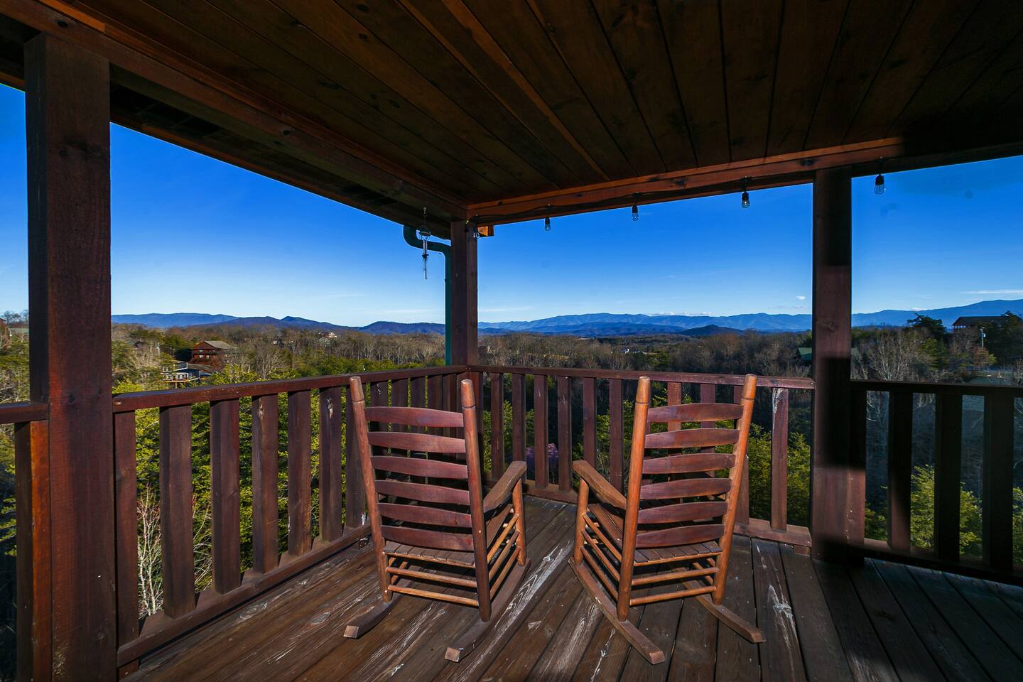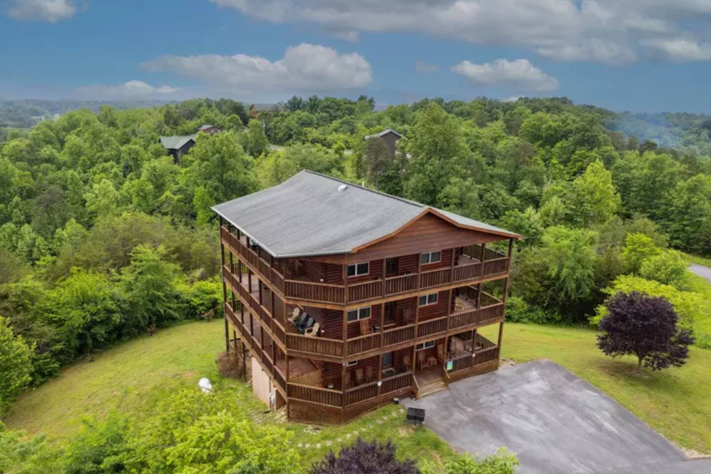 - Each level features wraparound porches with panoramic views of the Great Smoky Mountains.