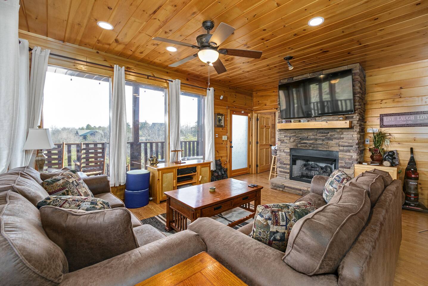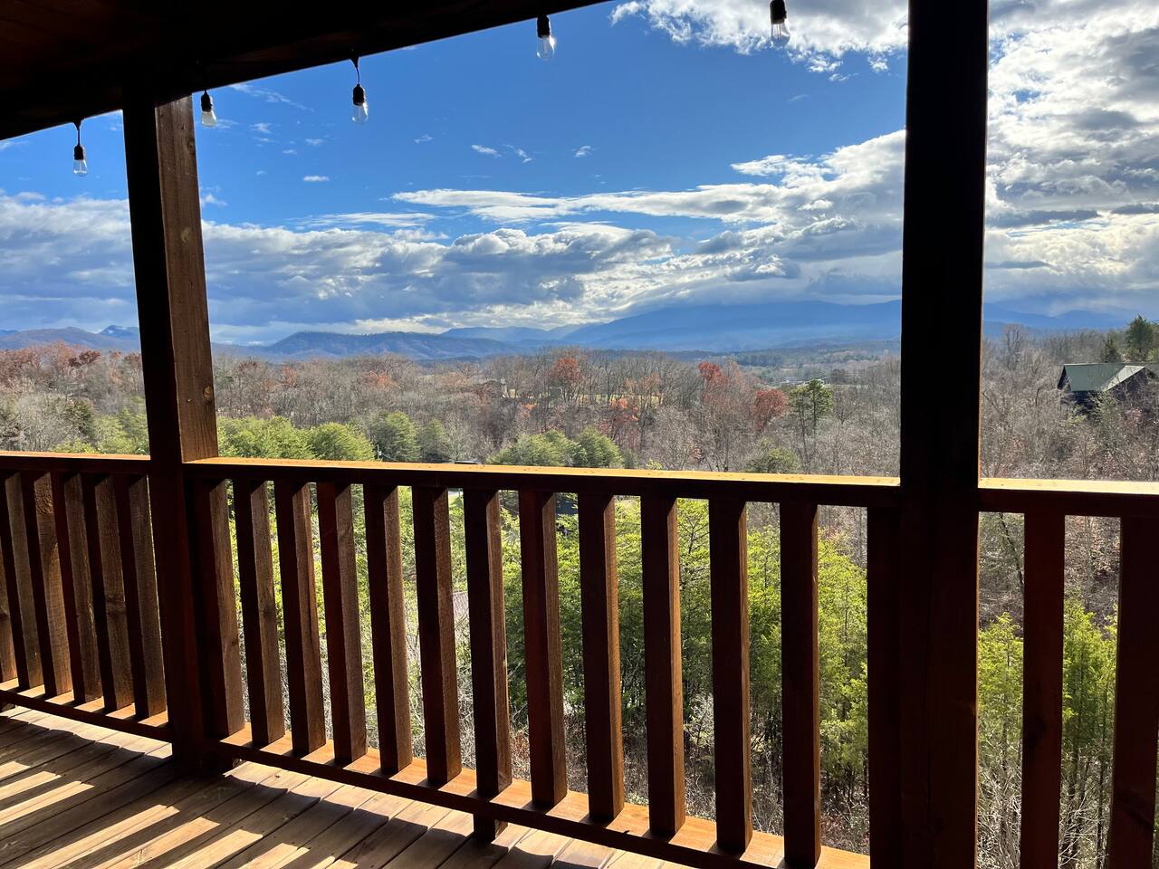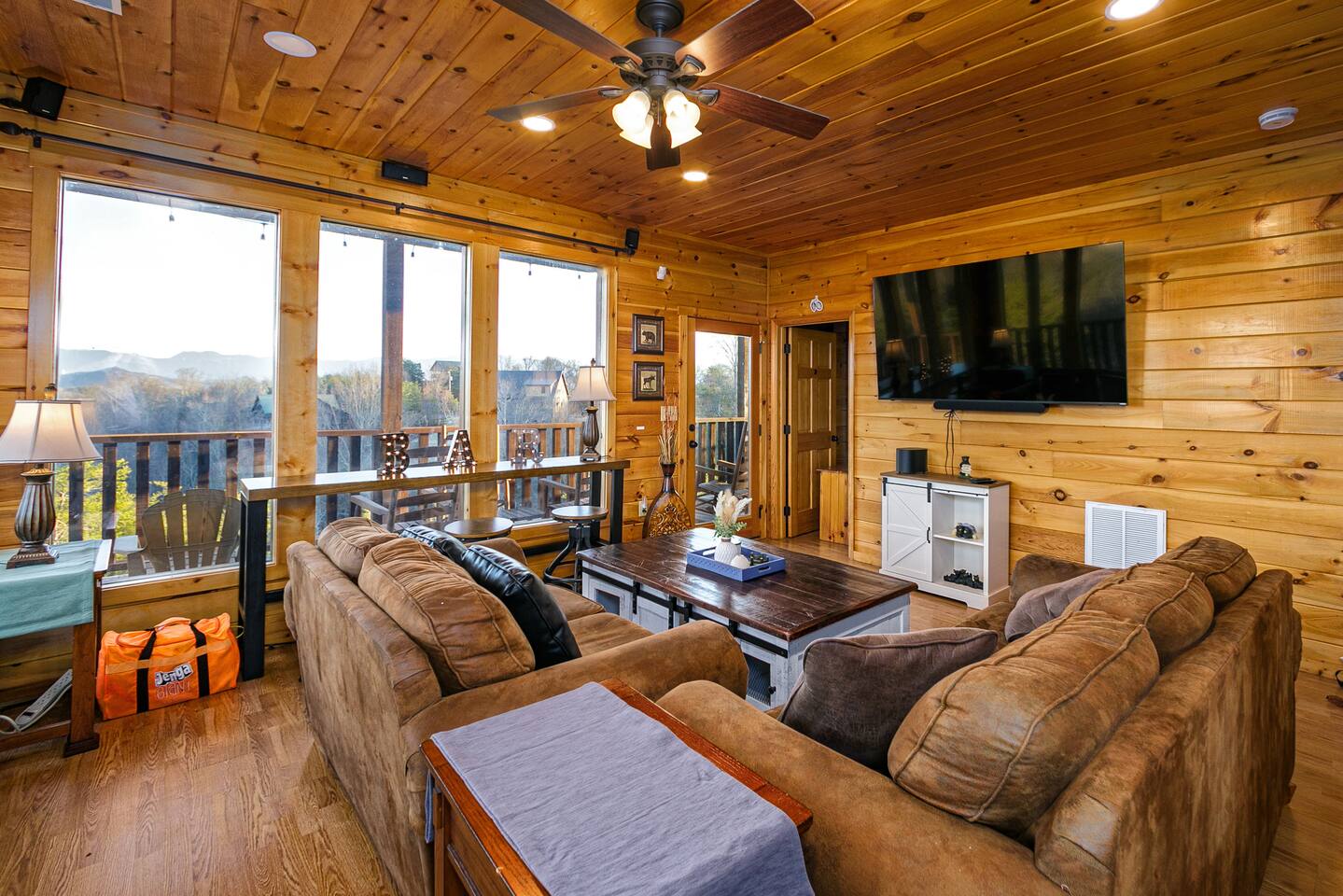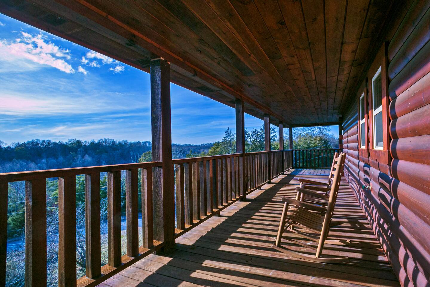 - Each level features wraparound porches with panoramic views of the Great Smoky Mountains.