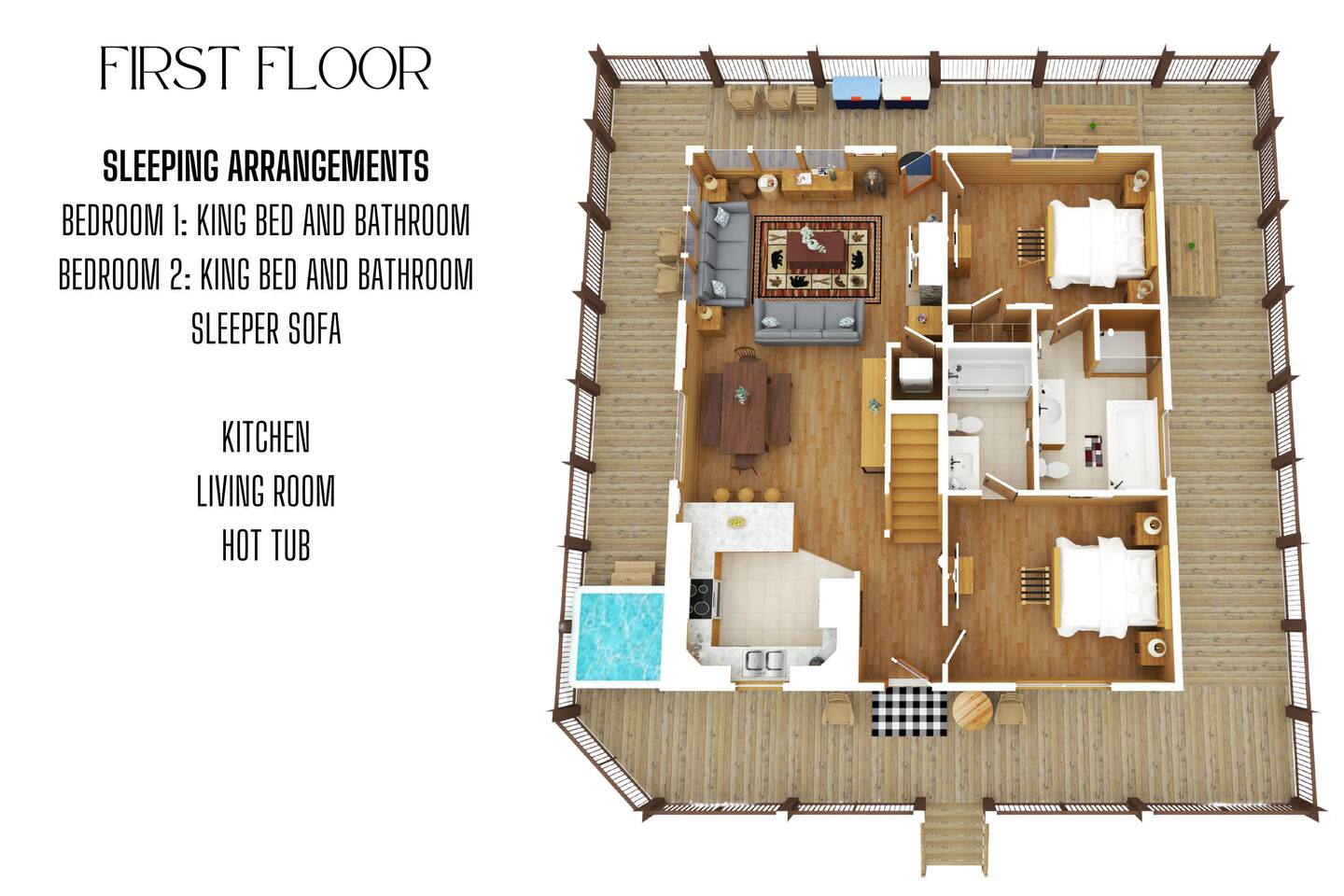 - Additional sleeping options: 2 sleeper sofas—one on the first floor and one on the second floor