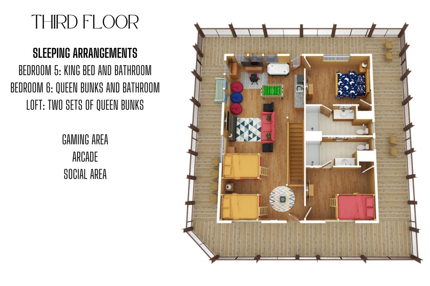- Third-Floor Loft: 2 sets of Queen-over-Queen bunk beds (great for accommodating groups or kids)