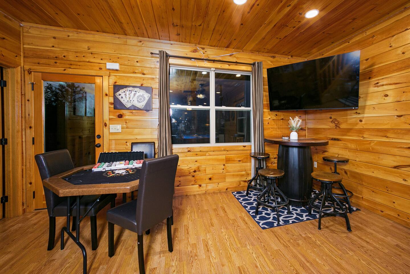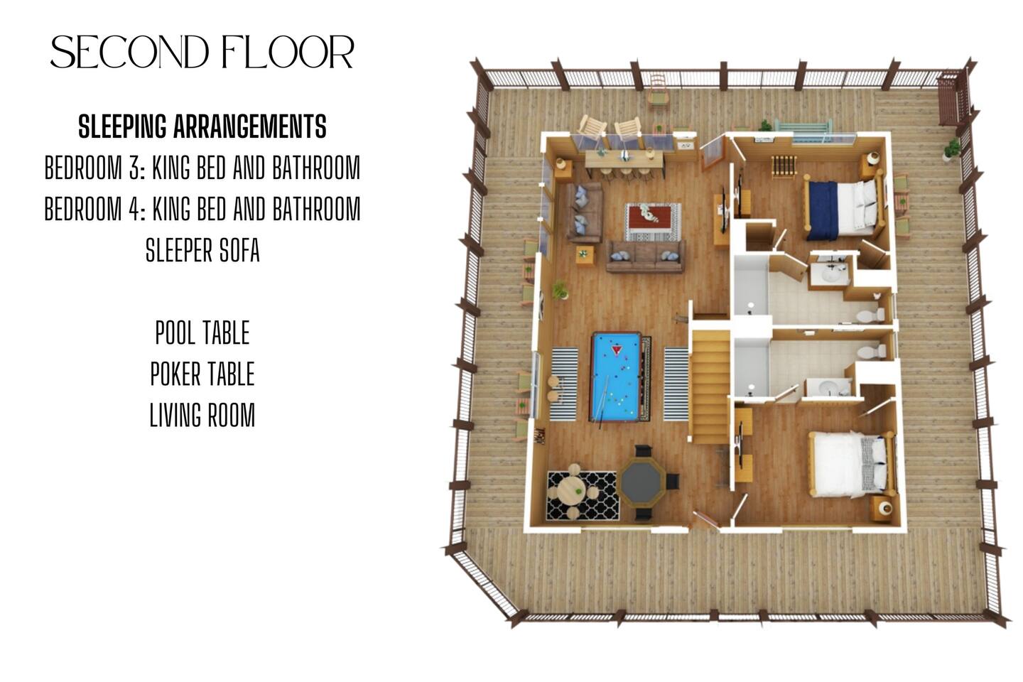 - Second level: Pool table, poker table, and a cozy living area with a large TV for group fun. You’ll love the coffee bar, TV with sound bar and sub woofer, and pub table under a second big screen TV.