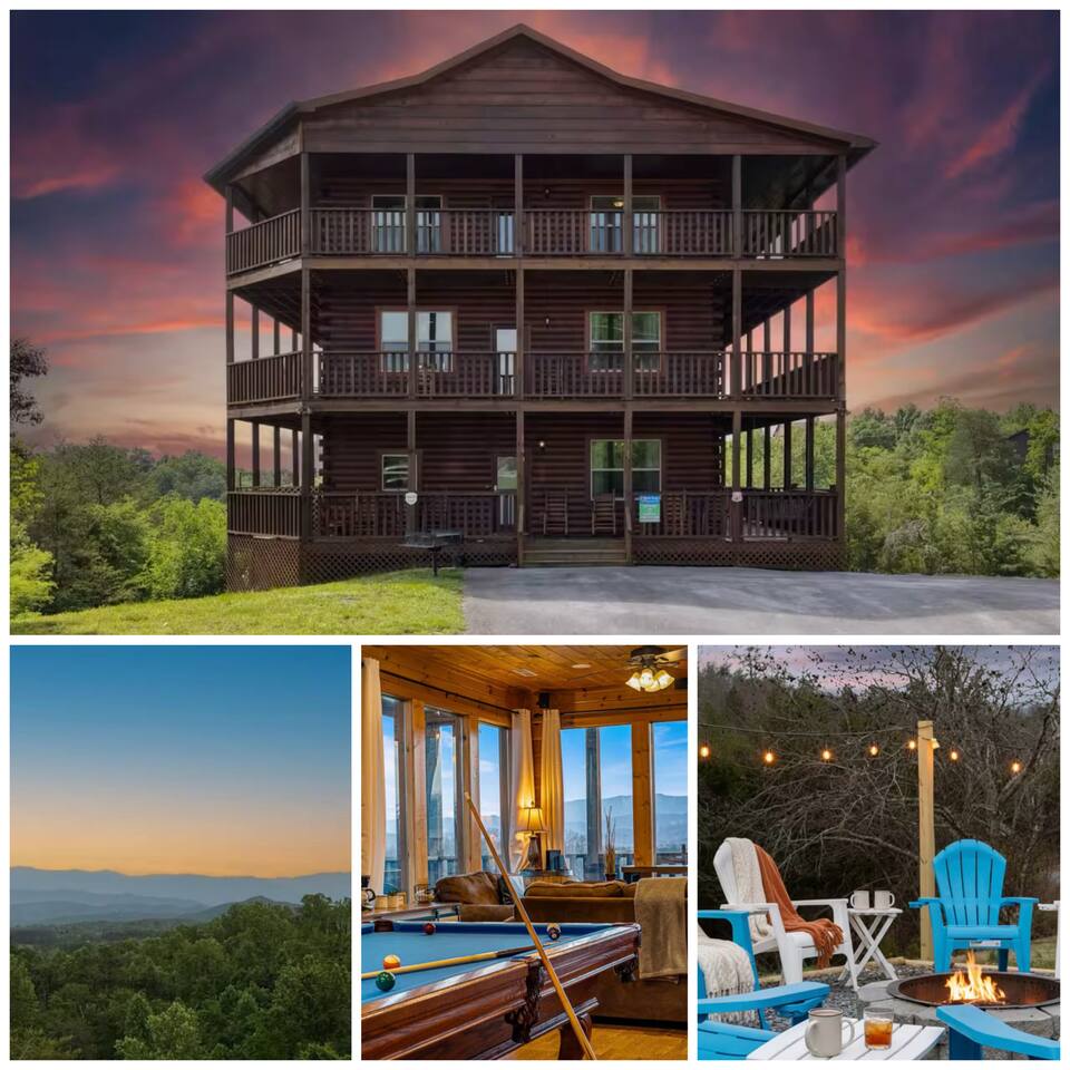 Breathtaking views in this 6 bedroom cabin ideal for hosting large parties. Paved roads & plenty of parking, w/3 stories, each with a wraparound porch offering a magnificent panoramic view of the Great Smoky Mountains. Breathtaking sunrises from the back porch each morning and the sunset is just as spectacular!
