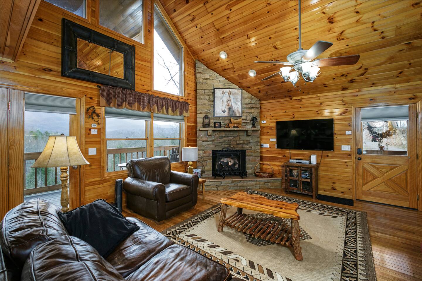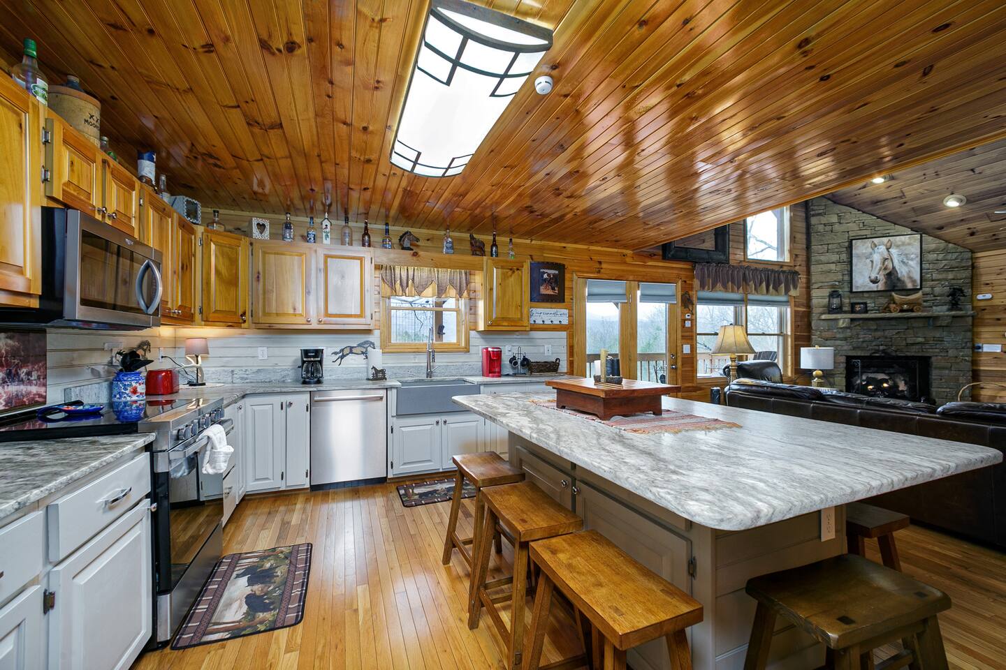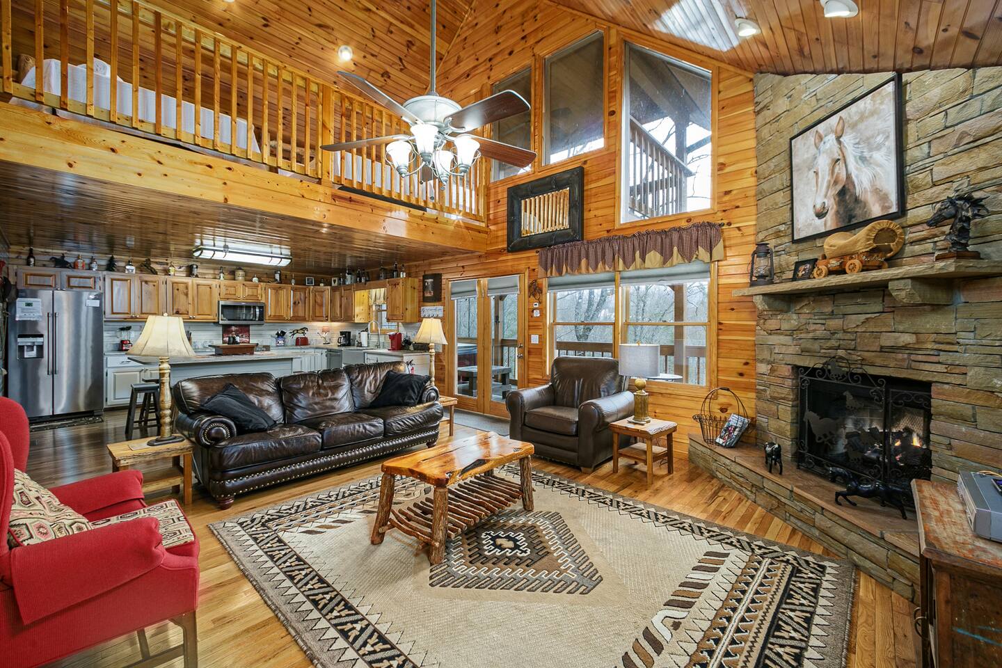 From the moment you step inside, you’ll be greeted by stunning views from every room, enhanced by the cabin’s vaulted ceilings, expansive windows, and thoughtful decor. The state-of-the-art kitchen flows seamlessly into the cozy living area, where a stone fireplace and plush seating invite you to relax and unwind.