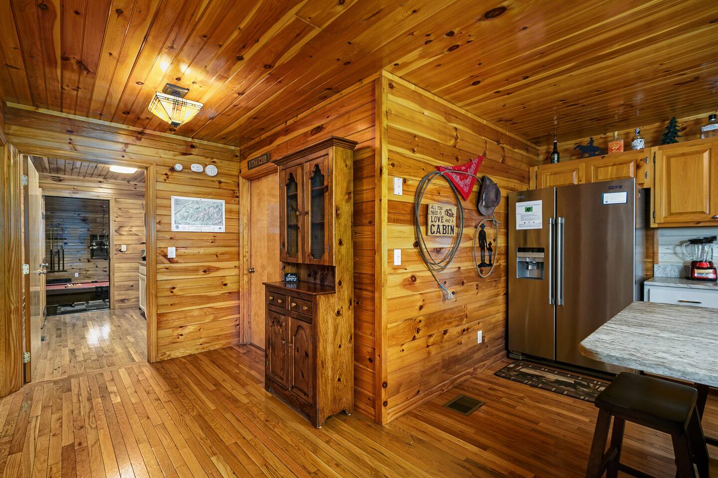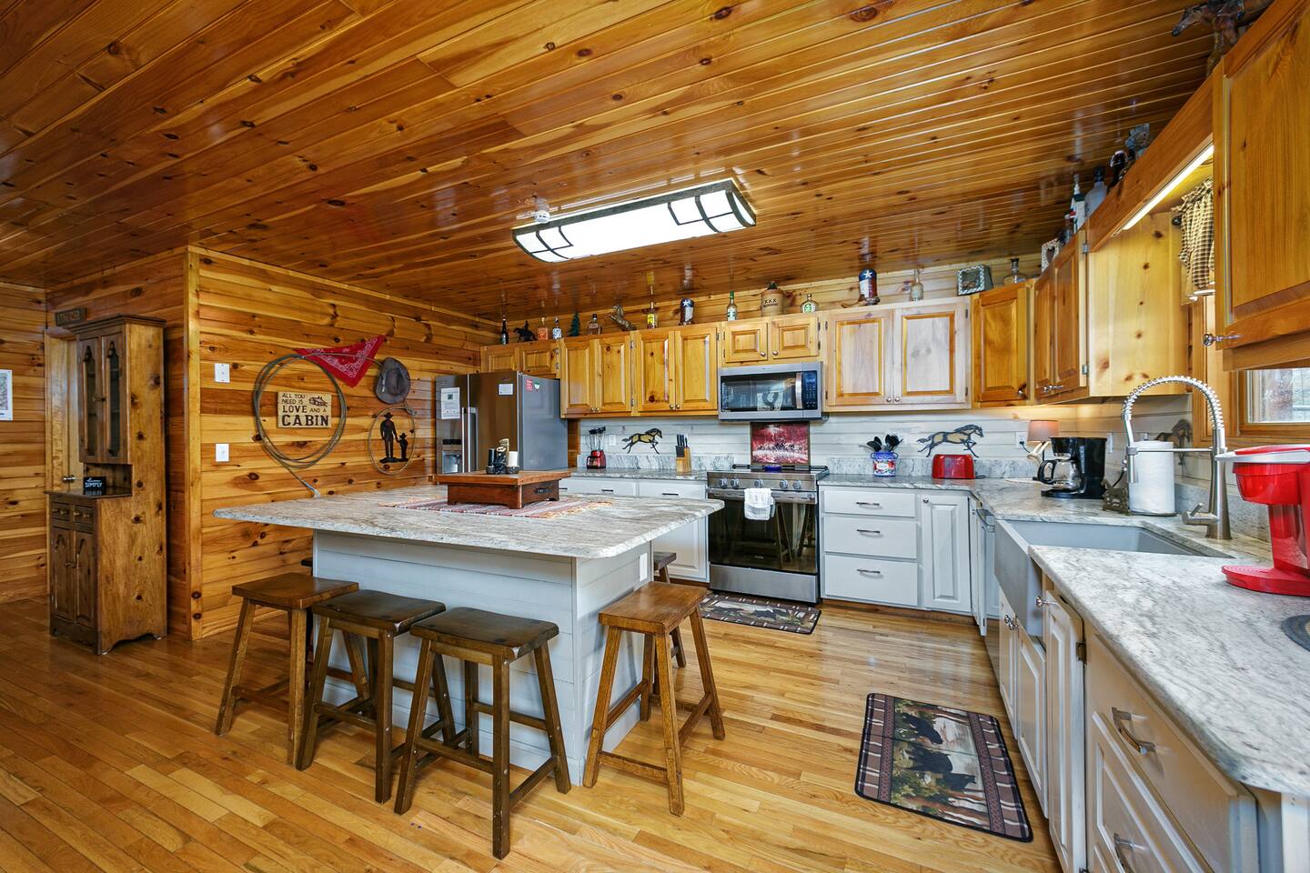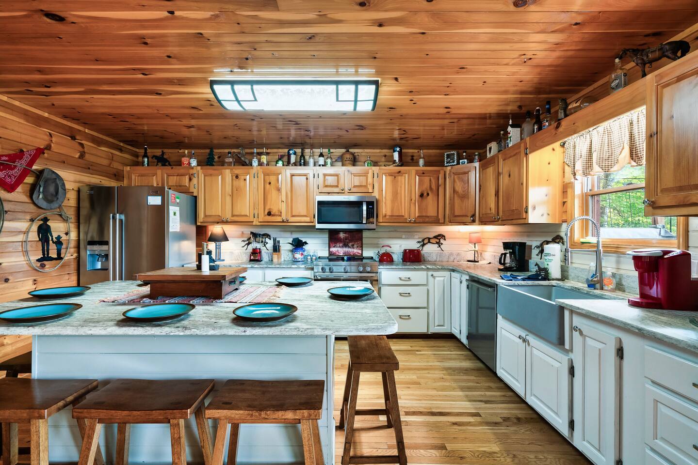 From the moment you step inside, you’ll be greeted by stunning views from every room, enhanced by the cabin’s vaulted ceilings, expansive windows, and thoughtful decor. The state-of-the-art kitchen flows seamlessly into the cozy living area, where a stone fireplace and plush seating invite you to relax and unwind.