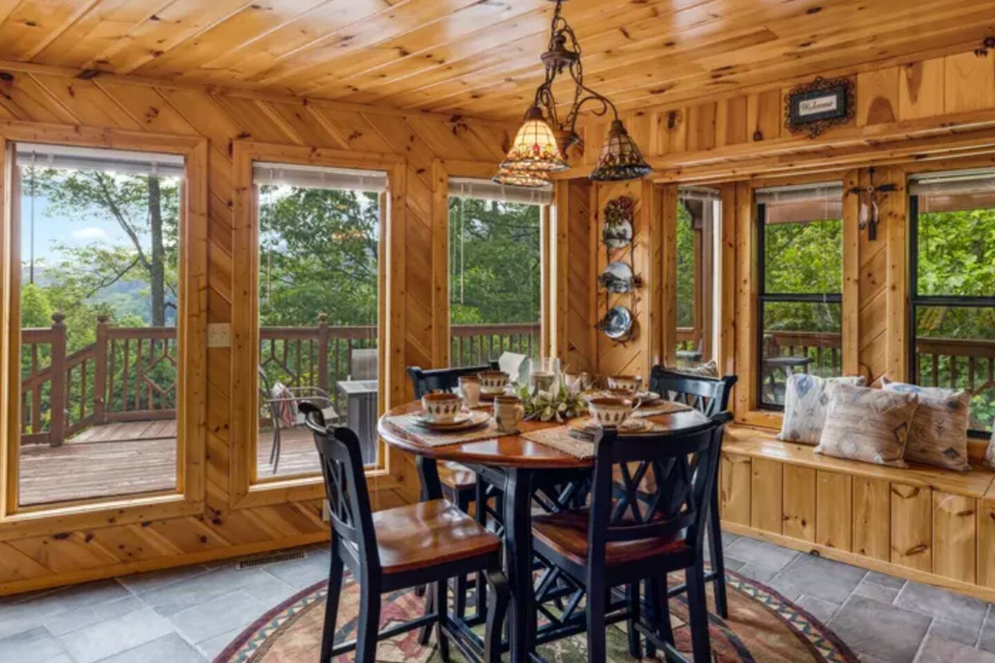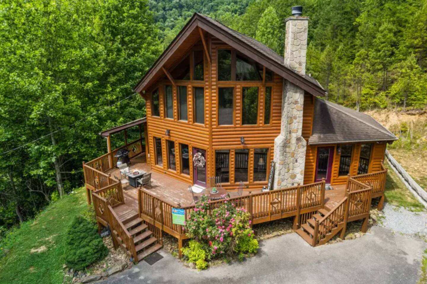 -Deck views: Outdoor dining with views, gas grill, and propane fire pit on the wraparound deck.