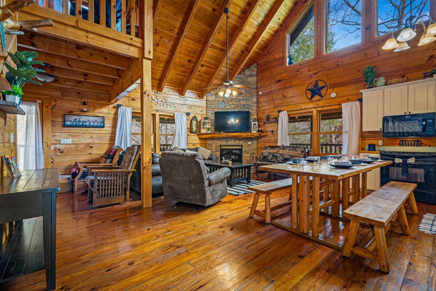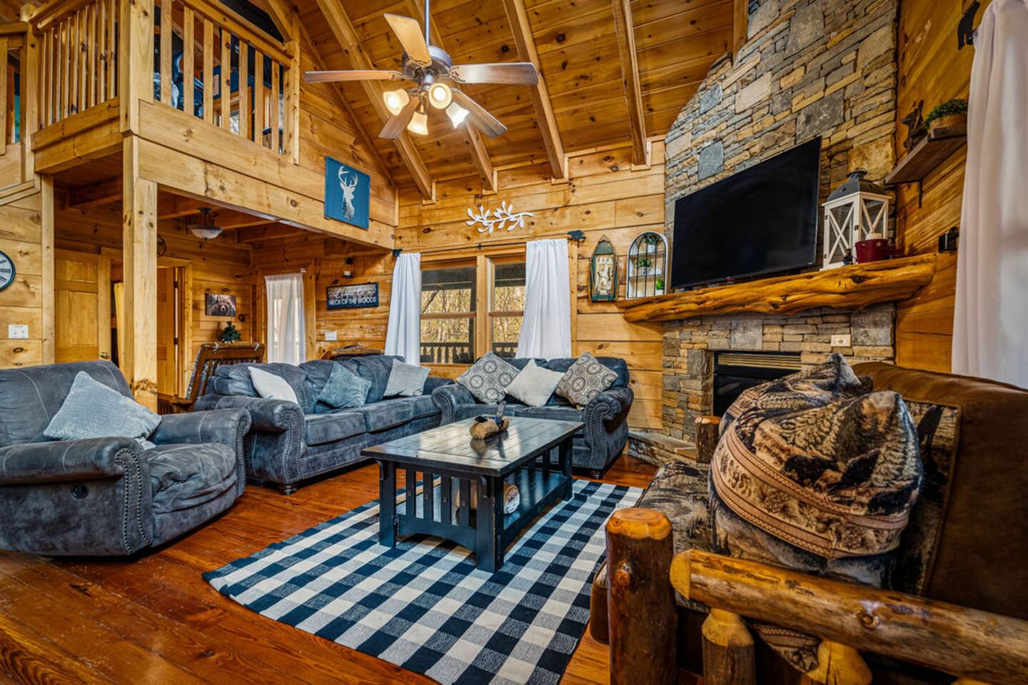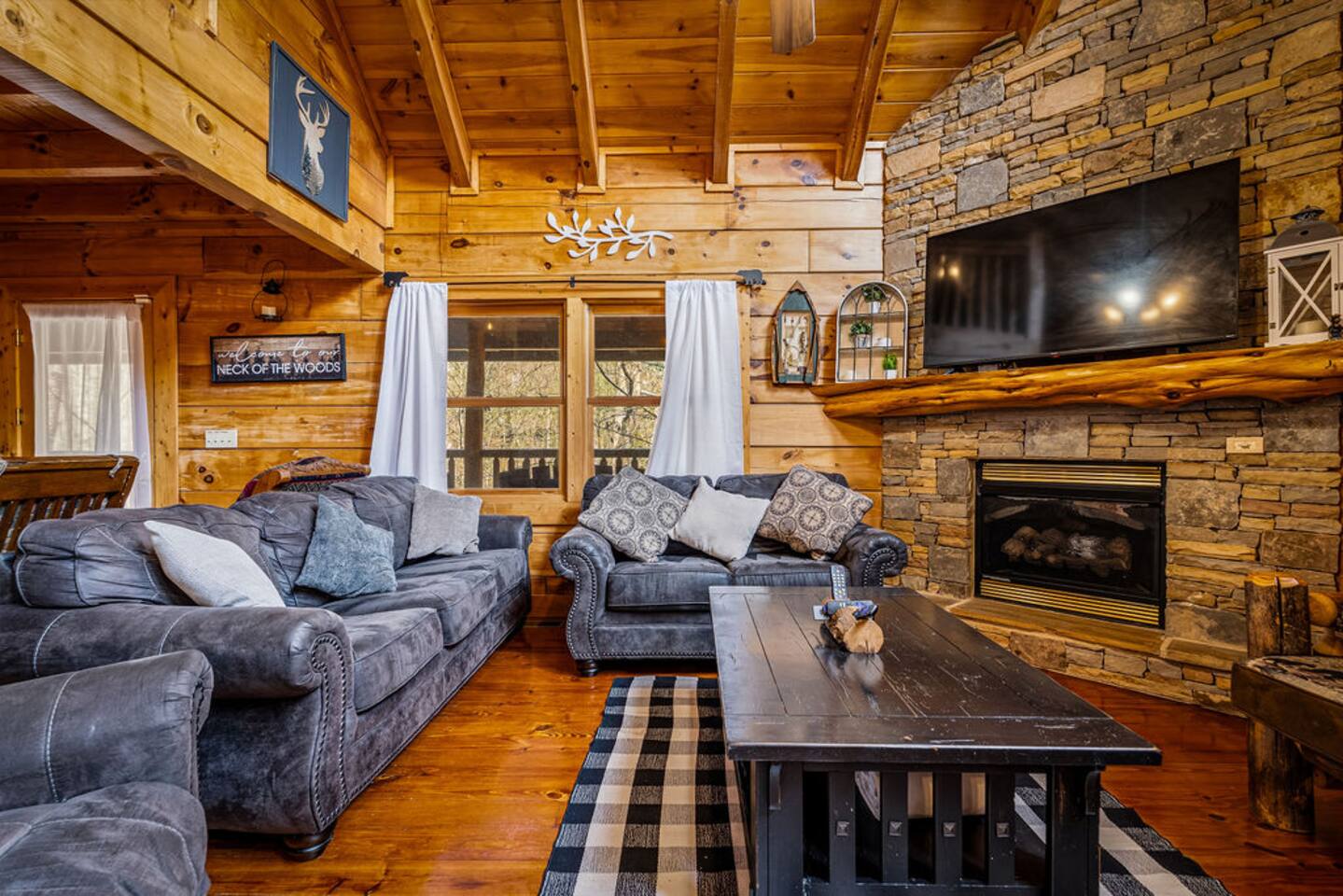 Step into the main level, where high cathedral ceilings, natural wood finishes, and a stacked stone fireplace create a warm and inviting living area. Gather with loved ones to share stories, stream your favorite shows on the flat-screen TV, or simply enjoy the cozy ambiance.