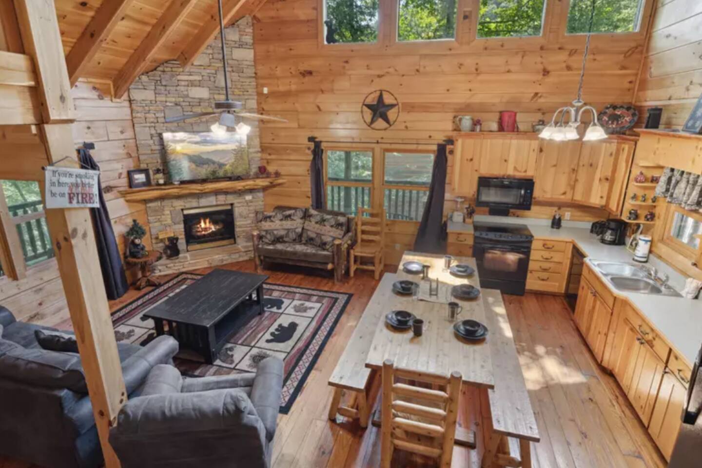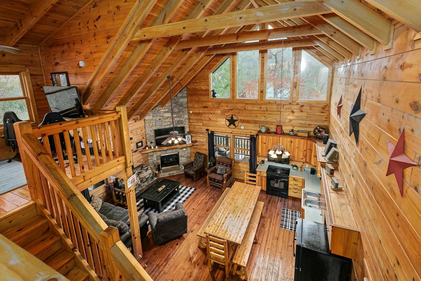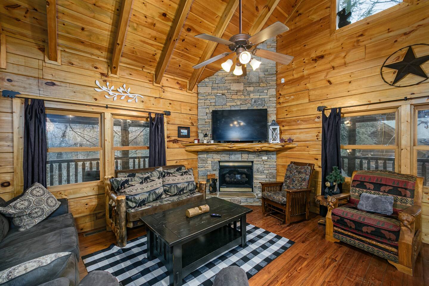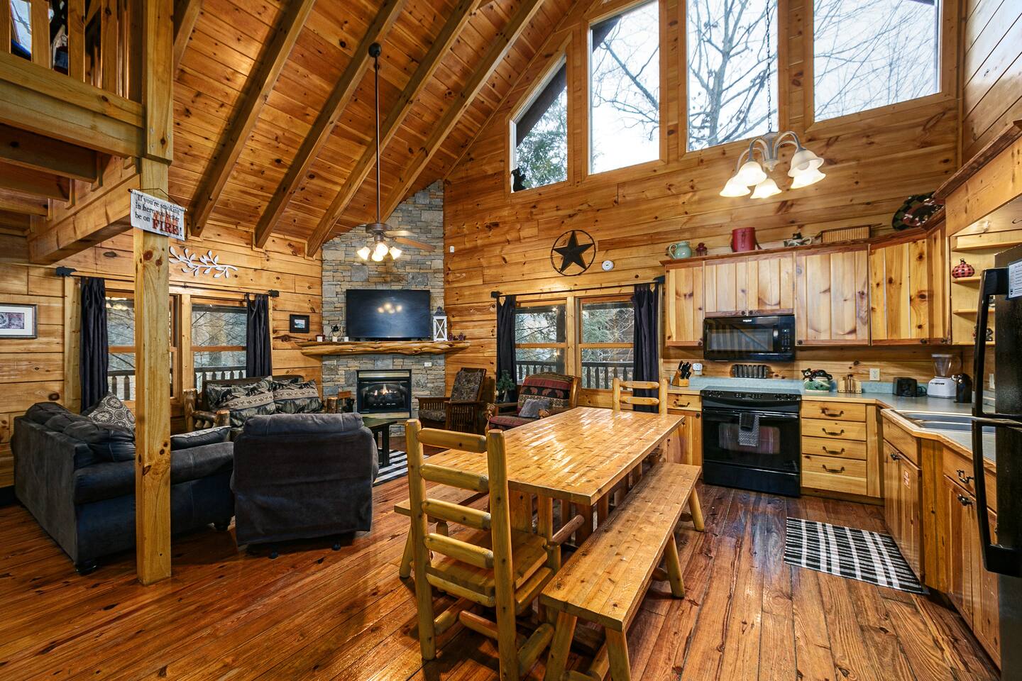Step into the main level, where high cathedral ceilings, natural wood finishes, and a stacked stone fireplace create a warm and inviting living area. Gather with loved ones to share stories, stream your favorite shows on the flat-screen TV, or simply enjoy the cozy ambiance.