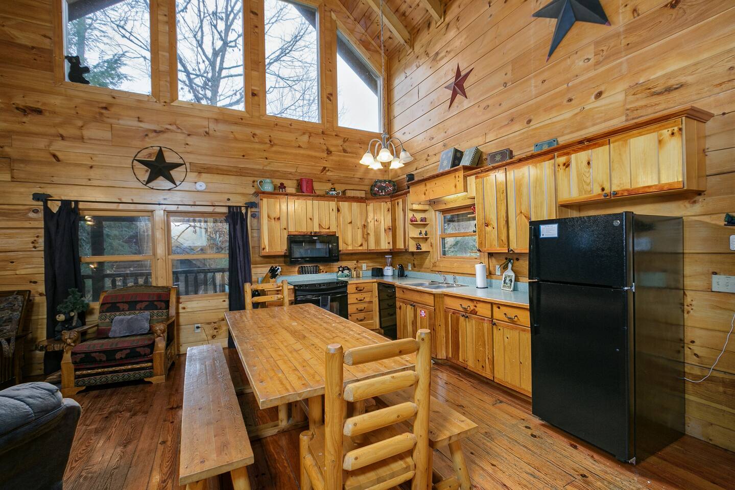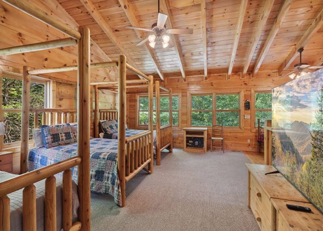 Discover your perfect mountain escape at Picture Perfect, a charming 4-bedroom, 3-bathroom log cabin nestled amidst pine trees in the serene Smoky Cove resort near Pigeon Forge. With 2,500 square feet of space, modern amenities, and a pet-friendly policy, this retreat is tailor-made for families or groups seeking relaxation and adventure in the Great Smoky Mountains.