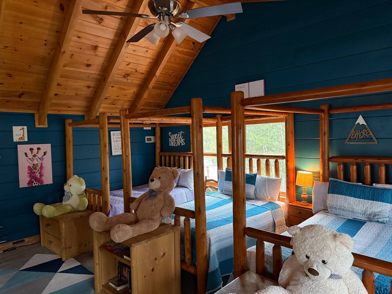 Venture upstairs to the spacious loft, overlooking the living area and kitchen below. Serving as the 4th bedroom, this area is perfect for kids or teens, featuring three full-sized beds and a dedicated computer area for play.