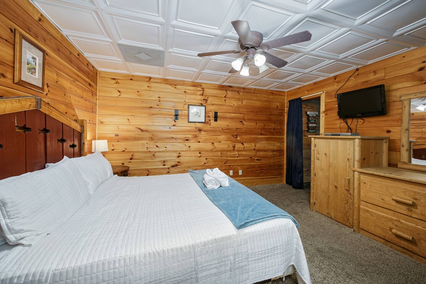 You’ll also find a convenient laundry room and storage area on this level, as well as another bedroom and full bathroom—complete with its own flat-screen TV—making it easy for everyone to have their own space to relax.